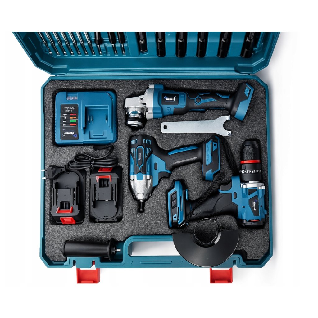 - ⚡ Výkonná aku sada 3 v 1 – vrtačka, úhlová bruska a rázový utahovák