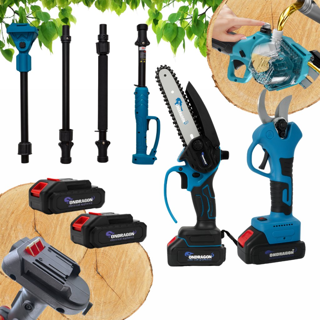 ⚡ Aku sada: Mini pila 6″ + nůžky na větve (2× Li-Ion baterie) + 2m tyč
