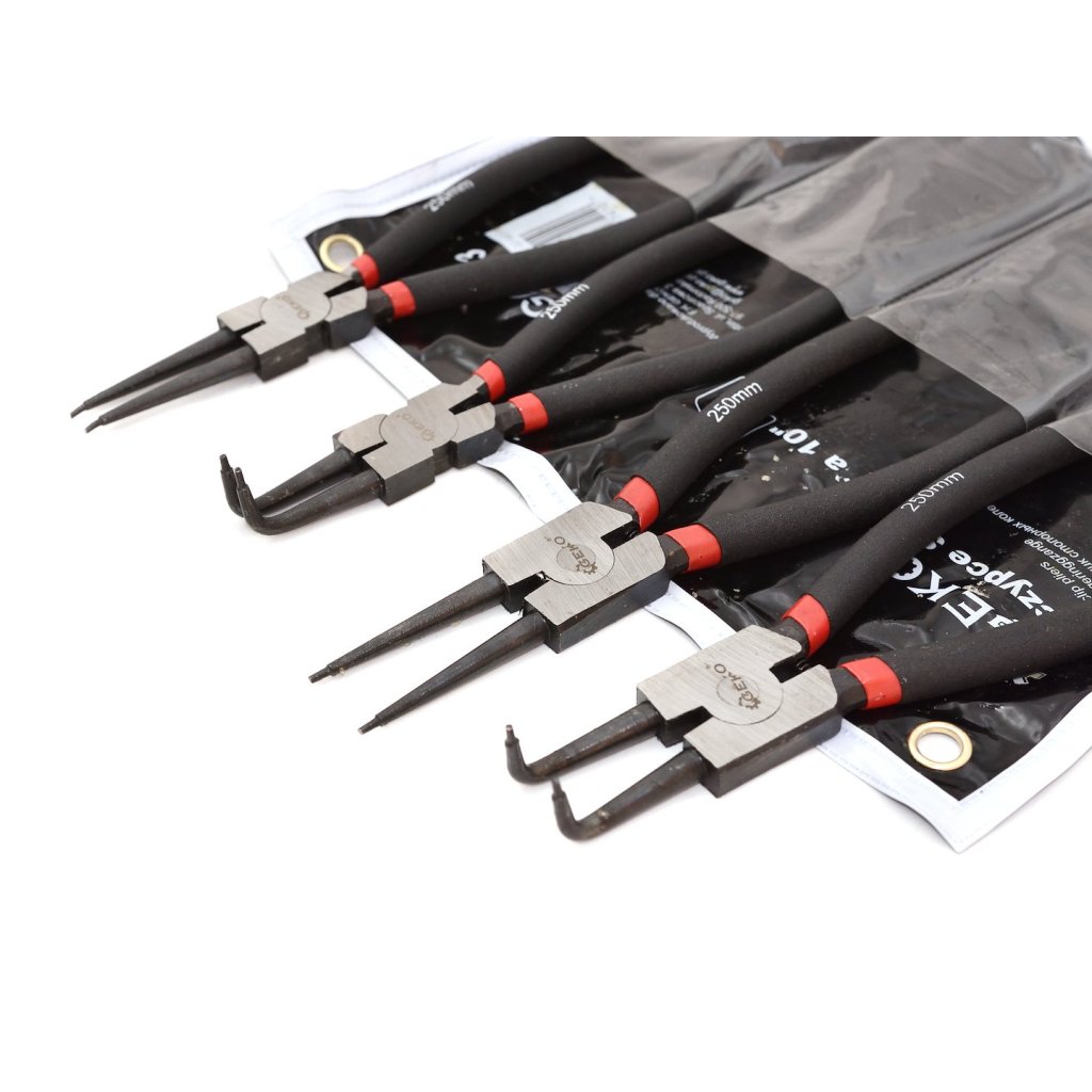 Sada kleští umožňuje montáž a demontáž vnitřních (rozpínacích uvnitř pouzdra) a vnějších (svorkových na vnější straně hřídele) pojistných kroužků. Sada obsahuje 4 druhy kleští.