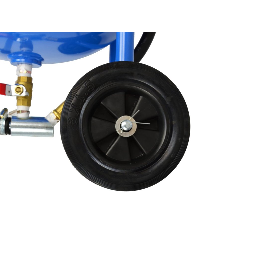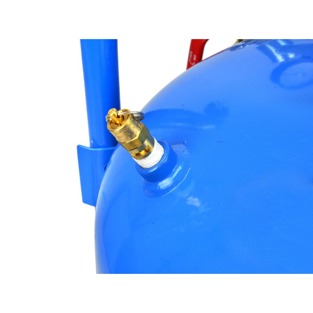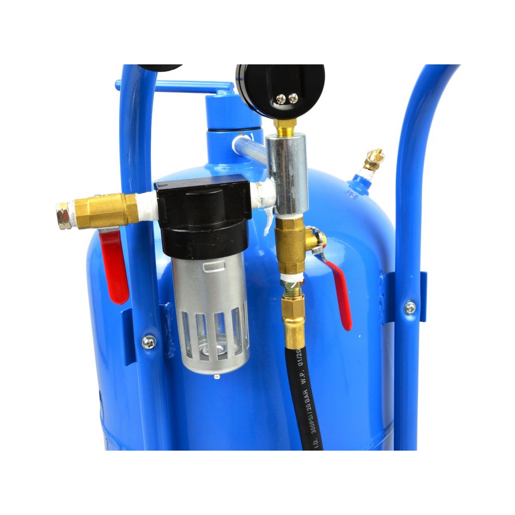 Mobilní tlaková pískovačka (sifonová) o objemu 38 litrů. Ideální pro renovaci, údržbu, práci v karosářských a mechanických servisech a výrobních závodech. Vybavena tryskami a pískovací pistolí, uzavíracím ventilem, manometrem, pískovacím hadicím, nálevkou pro plnění nádrže a ochrannou maskou s plexisklovým sklem.