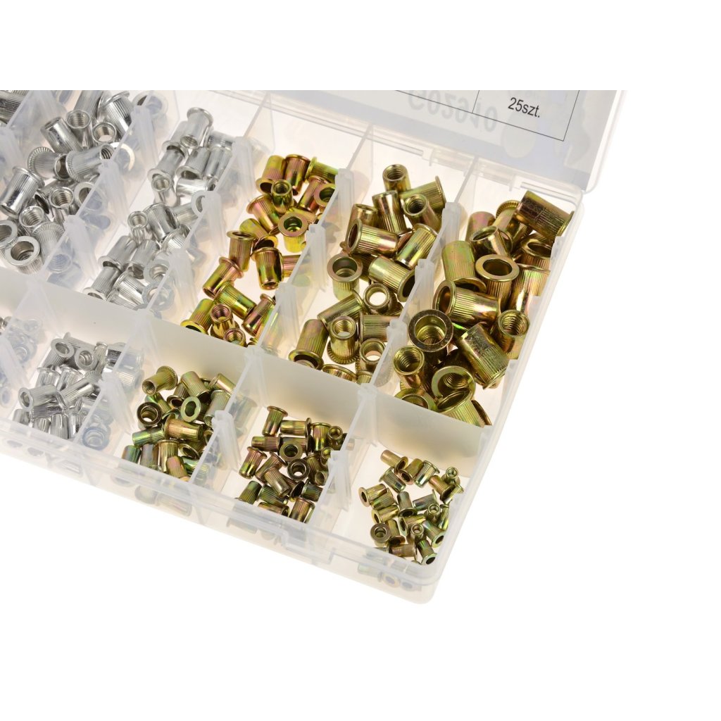 Sada 300 hliníkových a ocelových nýtovacích matic. V balení jsou velikosti M3, M4, M5, M6, M6, M10.