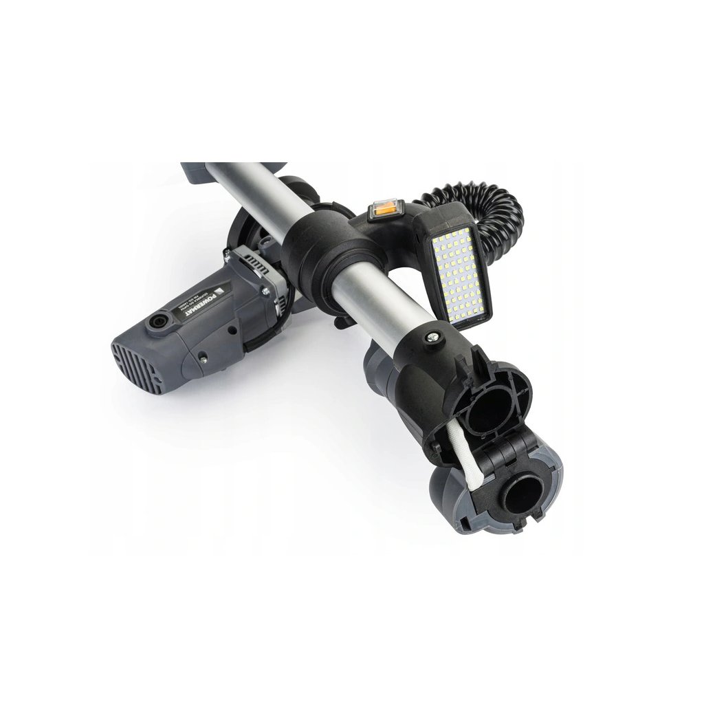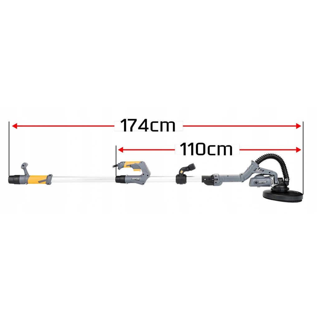 Bruska má funkci výsuvné rukojeti, díky které snadno prodloužíte pracovní dosah zařízení a dostanete se i do nejvzdálenějších rohů stěny. Po odklopení rukojeti je délka brusky 174 cm, díky čemuž po instalaci pružiny táhnoucí základnu do svislice můžete povrch stropů snadno obrousit. Po složení je mlýnek dlouhý 67 cm, což usnadňuje přepravu zařízení.