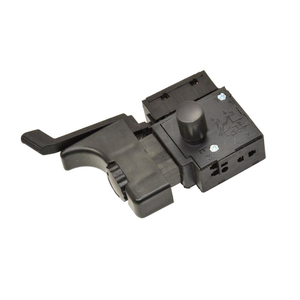 Tlačítkový spínač pro vrtačku FERM. Má nastavení otáček, nastavení směru otáčení vpravo/vlevo a aretaci spínače v poloze trvale zapnuto.