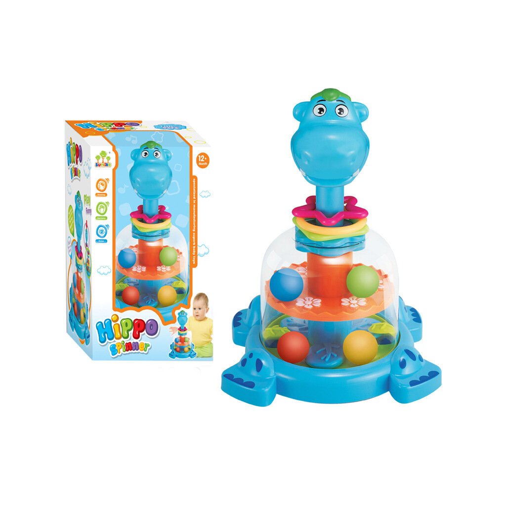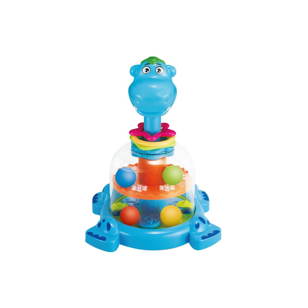 - Když stisknete hlavu hrošíka, uvnitř se roztáčí kolo s barevnými kuličkami, které tančí a skáčou, zaujmou a baví každého malého objevitele