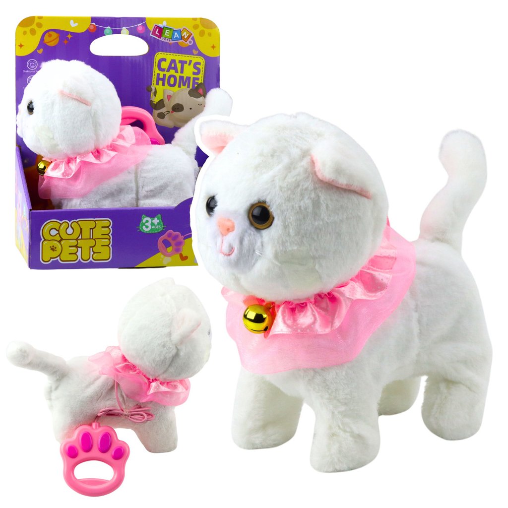 Interaktivní bílá kočka s růžovou volánkou a zvonečkem na vodítku je roztomilá hračka, která okouzlí každé dítě.