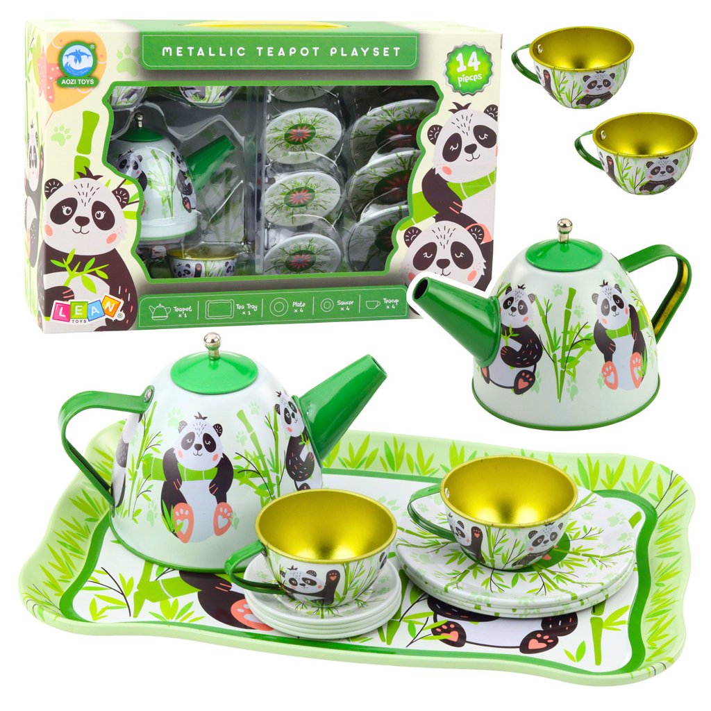 Kovová čajová sada pro děti – Konvička, Šálky, Talířky, Panda, Zelená, 14 dílů