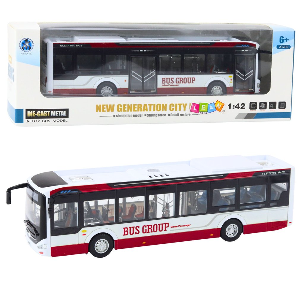 Kovový Městský Autobus 1:42 s Efekty, Červený - Realistický Model s Otevíracími Dveřmi