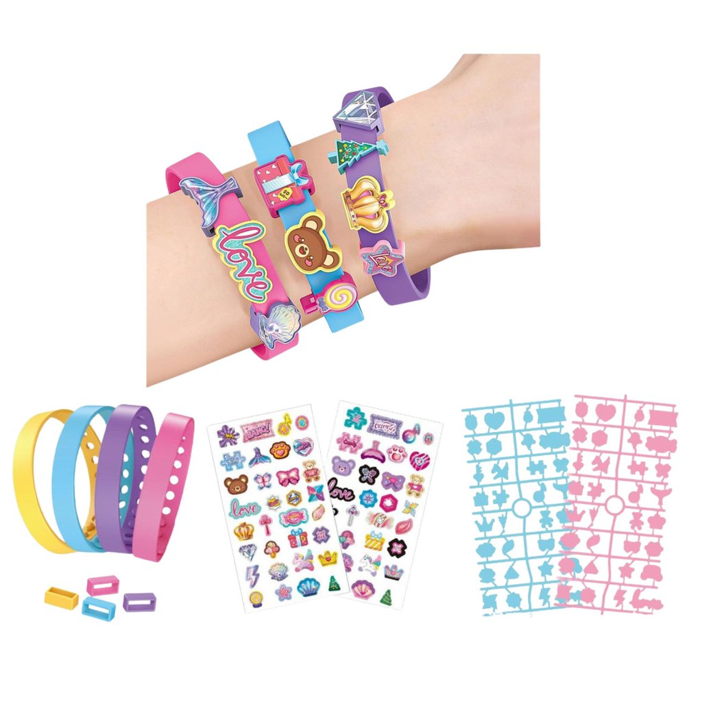 - Sada obsahuje čtyři nastavitelné gumové náramky v různých barvách a kolekci přívěsků a nálepek, které lze libovolně kombinovat