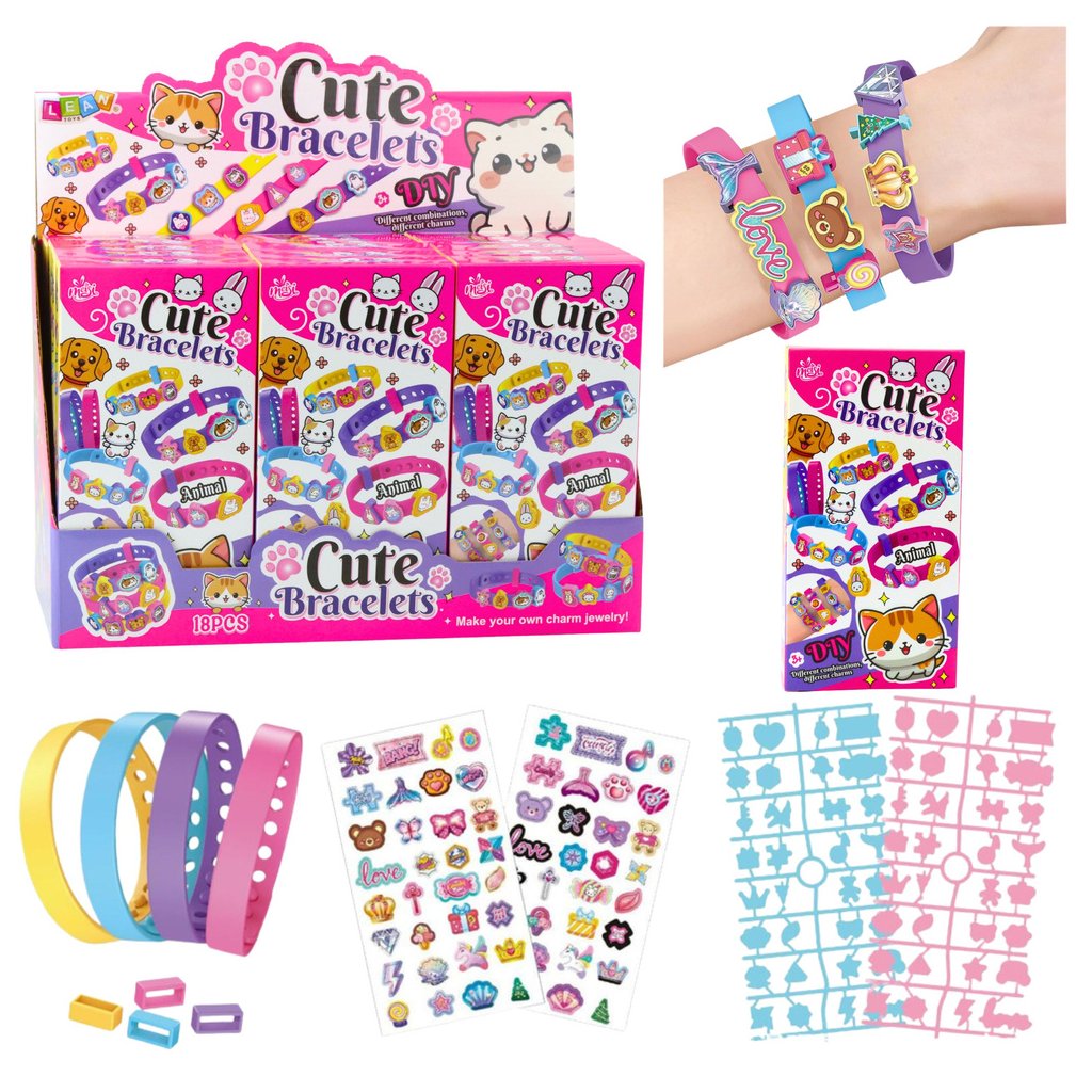 Sada DIY Náramků Přívěsky Zvířátka je kreativní balíček, který umožní dětem samostatně vytvářet pestrobarevné a originální ozdoby Sada obsahuje čtyři nastavitelné gumové náramky v různých barvách a kolekci přívěsků a nálepek, které lze libovolně kombinovat