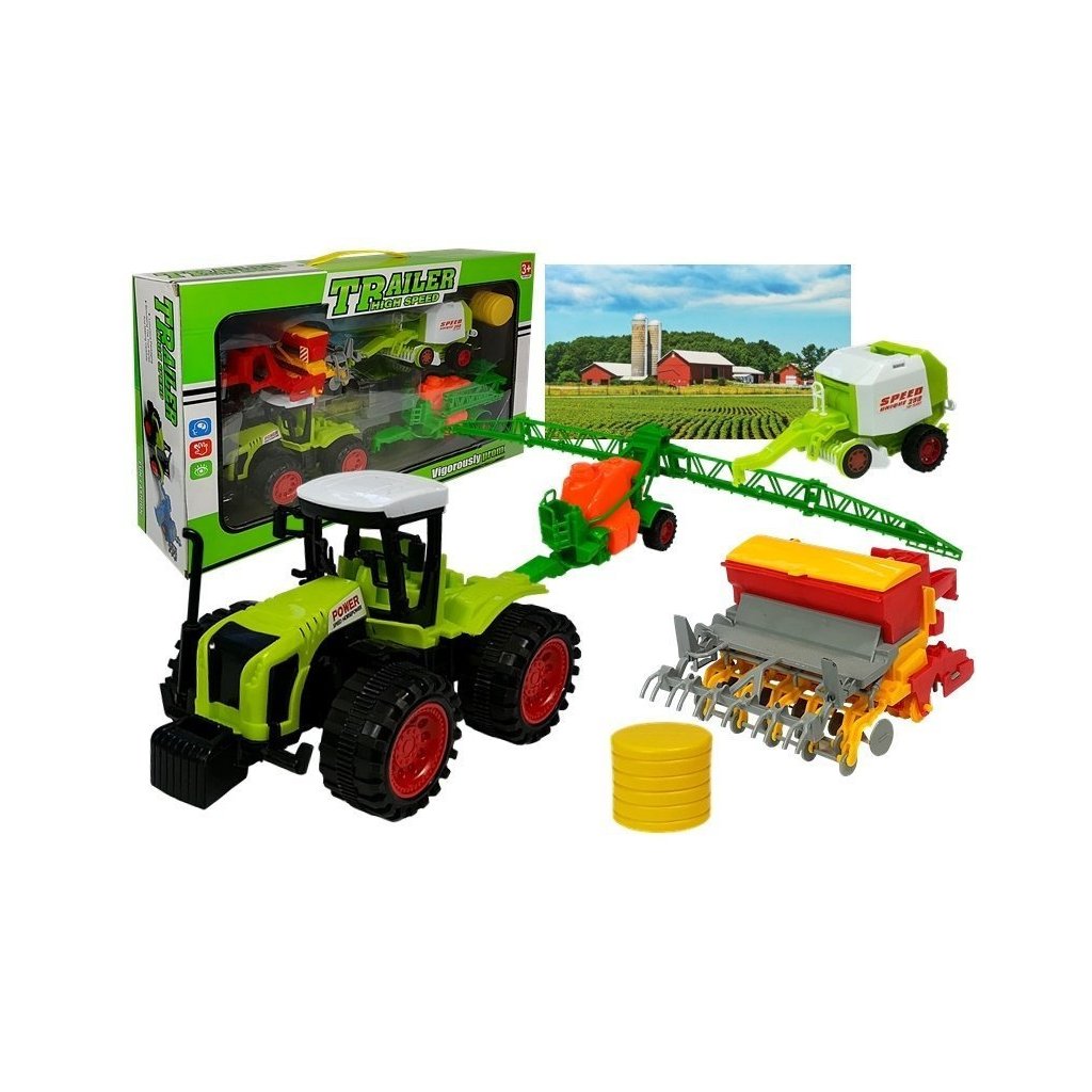 - Tato sada obsahuje traktor, postřikovač rostlin, rozmetadlo hnojiva a lis, vše v estetické zelené krabici s rukojetí pro snadnou přepravu