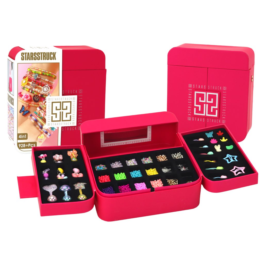 Sada na výrobu šperků v krabičce s přívěsky a sponkami Představujeme vám jedinečnou sadu pro výrobu náramků, zabalenou v elegantní růžové krabičce!