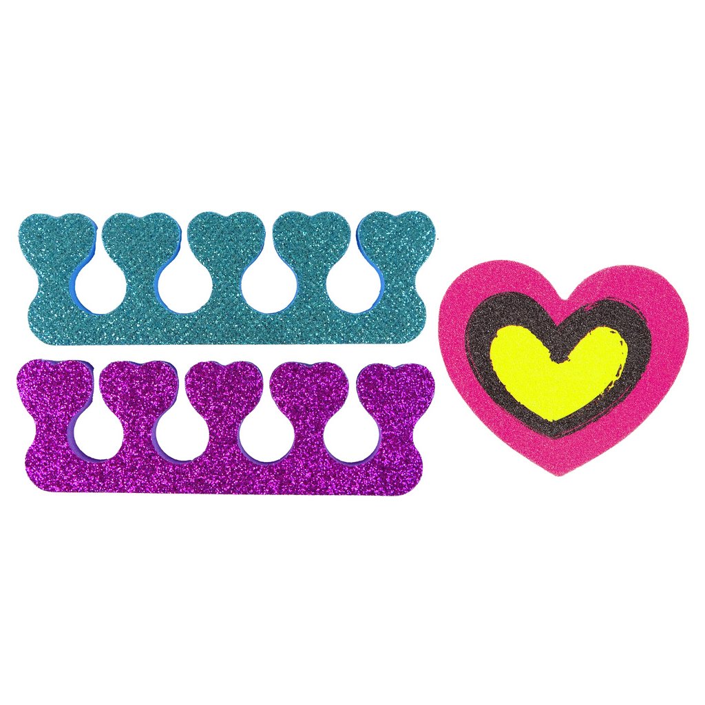 - Bohaté doplňky: Sada obsahuje brokátové oddělovače prstů, pilník ve tvaru srdíčka a čtyři výrazné barevné fixy