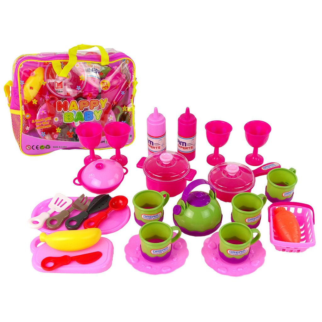 Velká sada kuchyňských doplňků v tašce Růžová kuchyňská sada pro dívky obsahuje všechny nezbytné prvky pro hraní si na malou hospodyňku nebo organizátorku oslavy pro kamarádky, a dokonce i hračky Sada se skvěle hodí pro společné vaření dítěte s rodiči