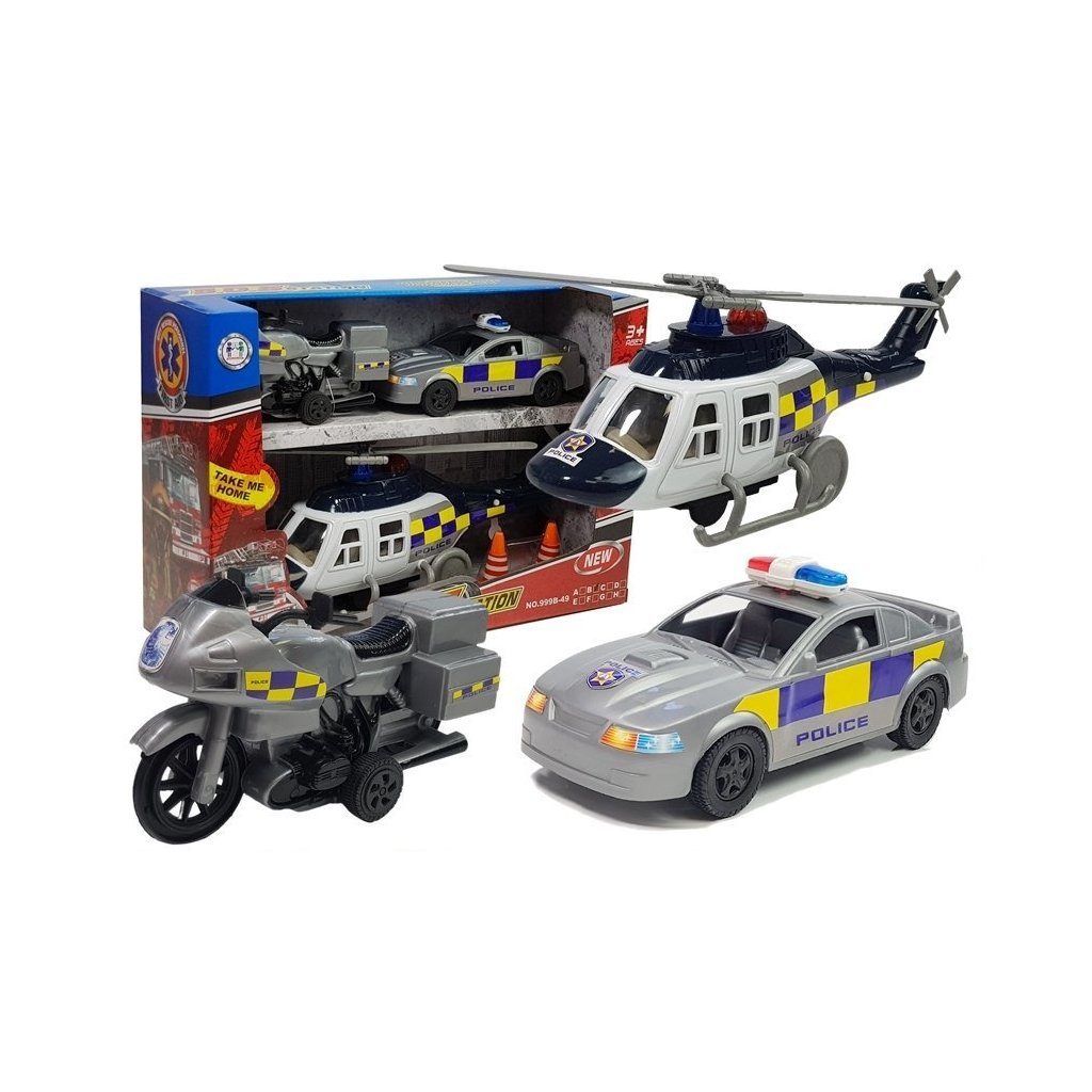 - Obsahuje realistické repliky policejních vozidel, jako je vrtulník, auto a motocykl, v bílo-modrém provedení s charakteristickými nápisy