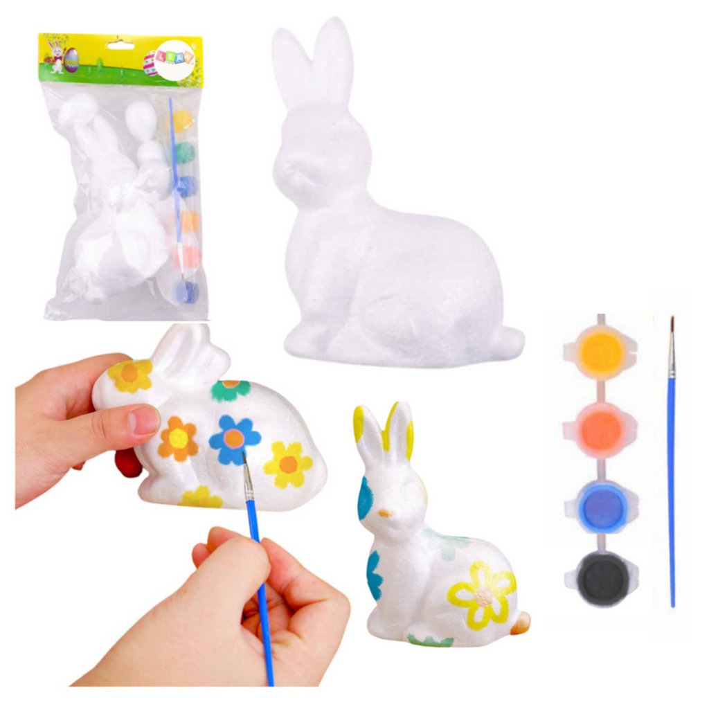 Sada obsahuje: jeden polystyrenový zajíček o rozměrech 14 x 9,5 cm Barvy: Sada čtyř intenzivních barev umožňuje snadné a přesné malování