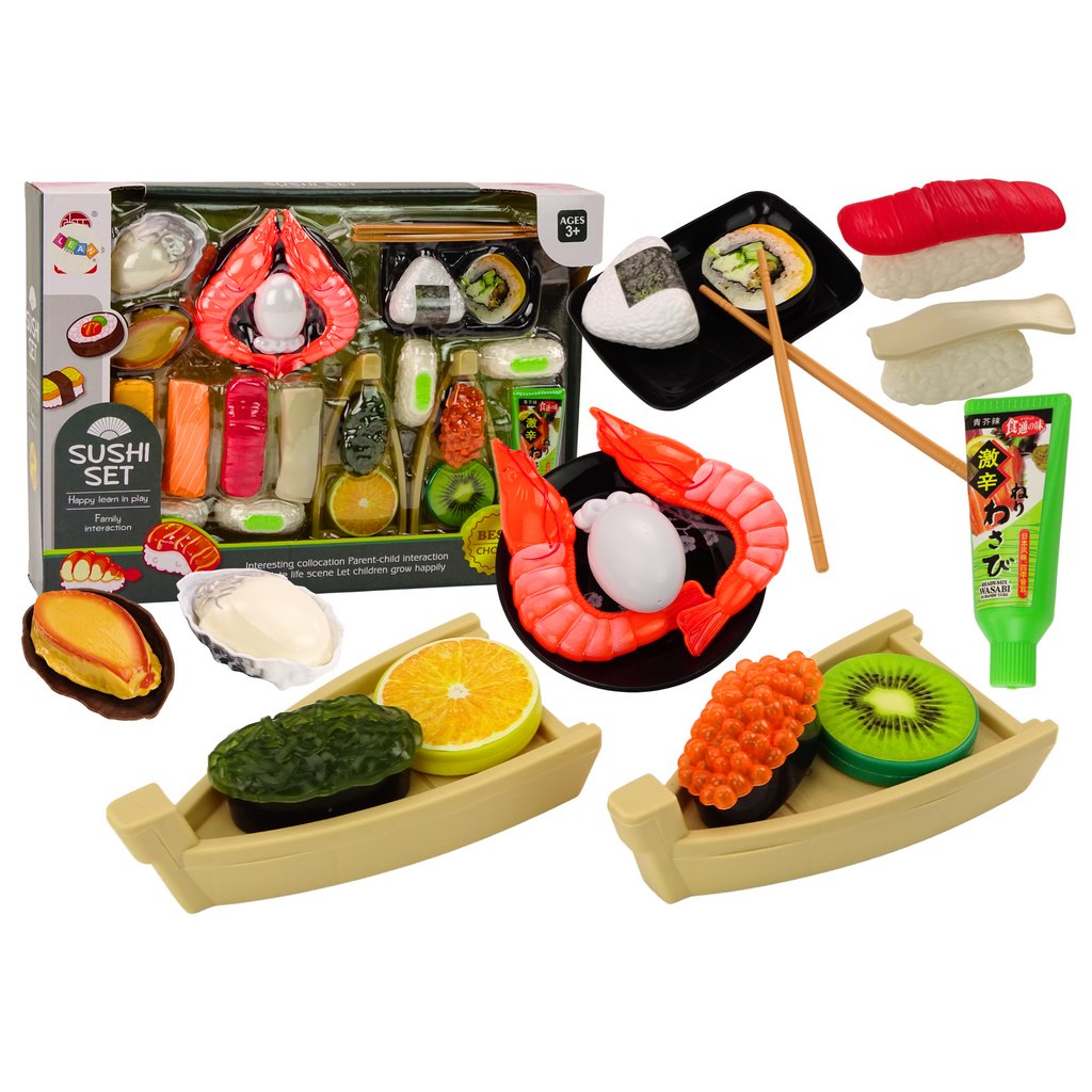 Mezi nimi jsou krevety, losos, wasabi, rýže, nori řasy a tyčinky k sushi Děti mohou předstírat, že jsou opravdovými sushi mistry, sestavovat a servírovat své vlastní verze oblíbených jídel