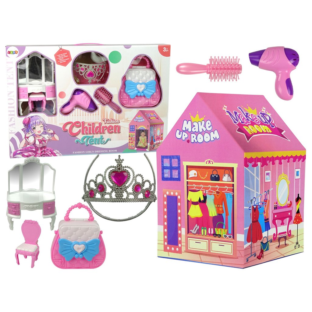 Princeznin stan pro děti Salon krásy Růžové doplňky Koruna Krásný stan pro malou princeznu! Každá malá holčička ráda napodobňuje maminku, sleduje, jak se krásně líčí nebo česá