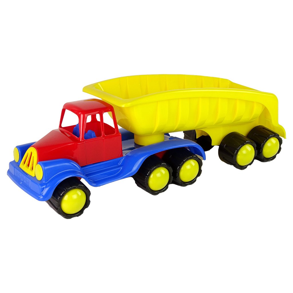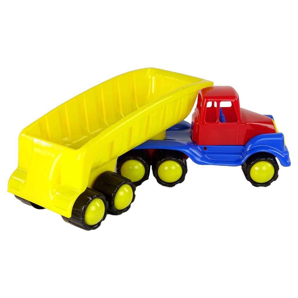 Velké auto s přívěsem 45 cm žluté Tento vůz je dlouhý až 70 cm a má otočný přívěs Díky velké nosnosti může každé dítě přepravovat své nejcennější poklady