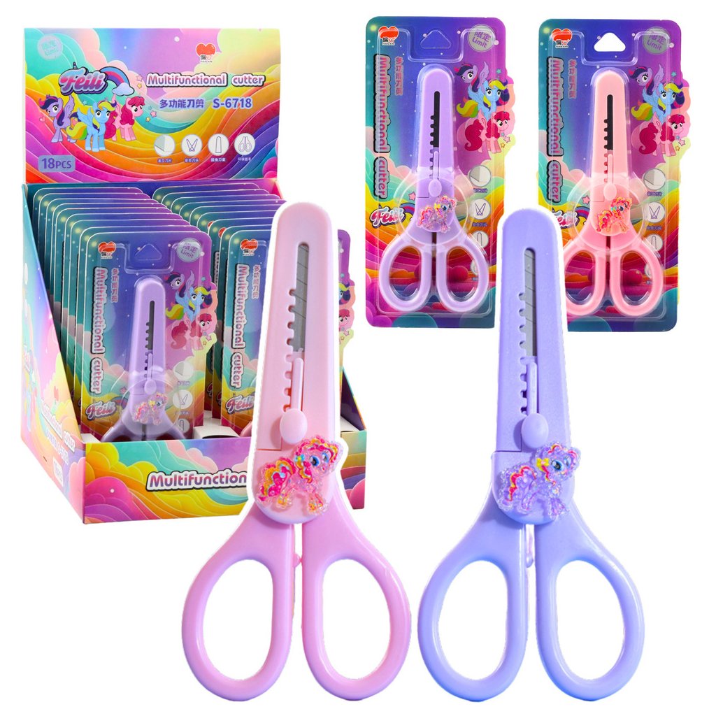 Integrovaná ochranná krytka na čepel zabraňuje náhodným poraněním a umožňuje bezpečné uložení v penálu, batohu nebo šuplíku Nůžky mají ergonomické úchyty, které jsou přizpůsobené malým rukám, a ozdobný koník s třpytivými prvky jim dodává jedinečný charakter