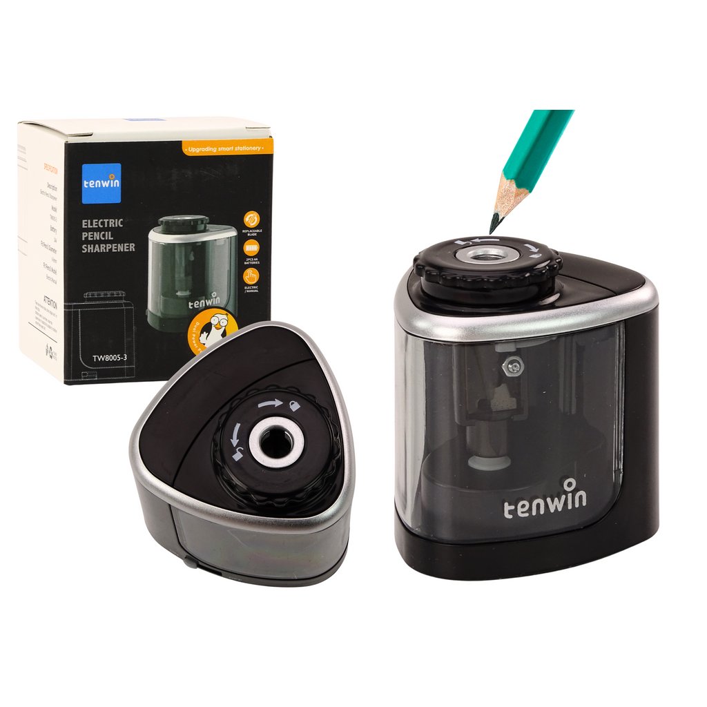 - Elektrické černé ořezávátko na pastelky a tužky o šířce 6-8 mm je všestranným společníkem pro všechny věkové skupiny