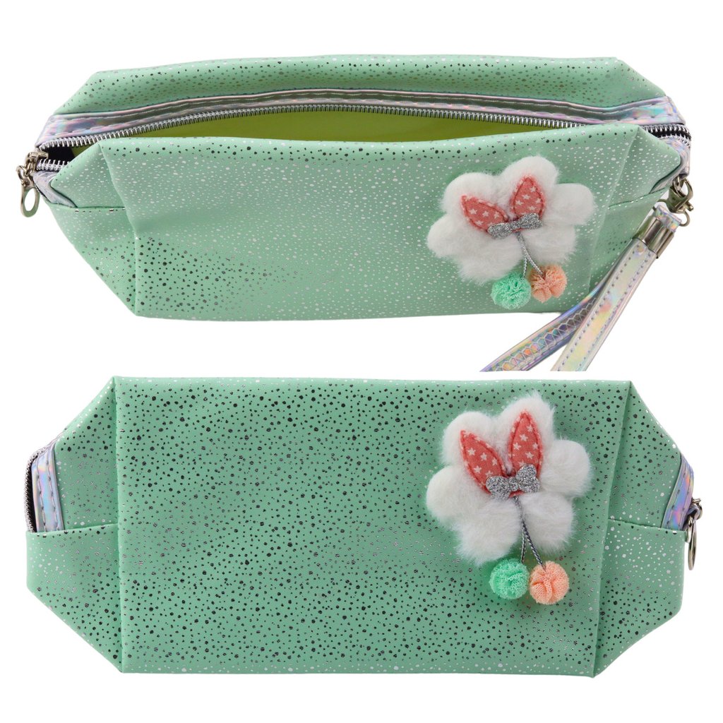 Stylové pouzdro kosmetická taštička je výjimečným doplňkem pro každou školní výbavu nebo každodenní použití Vyrobené v pastelové, mátové barvě, zdobené jemnými třpytivými částečkami, přitahuje pozornost svým jedinečným designem