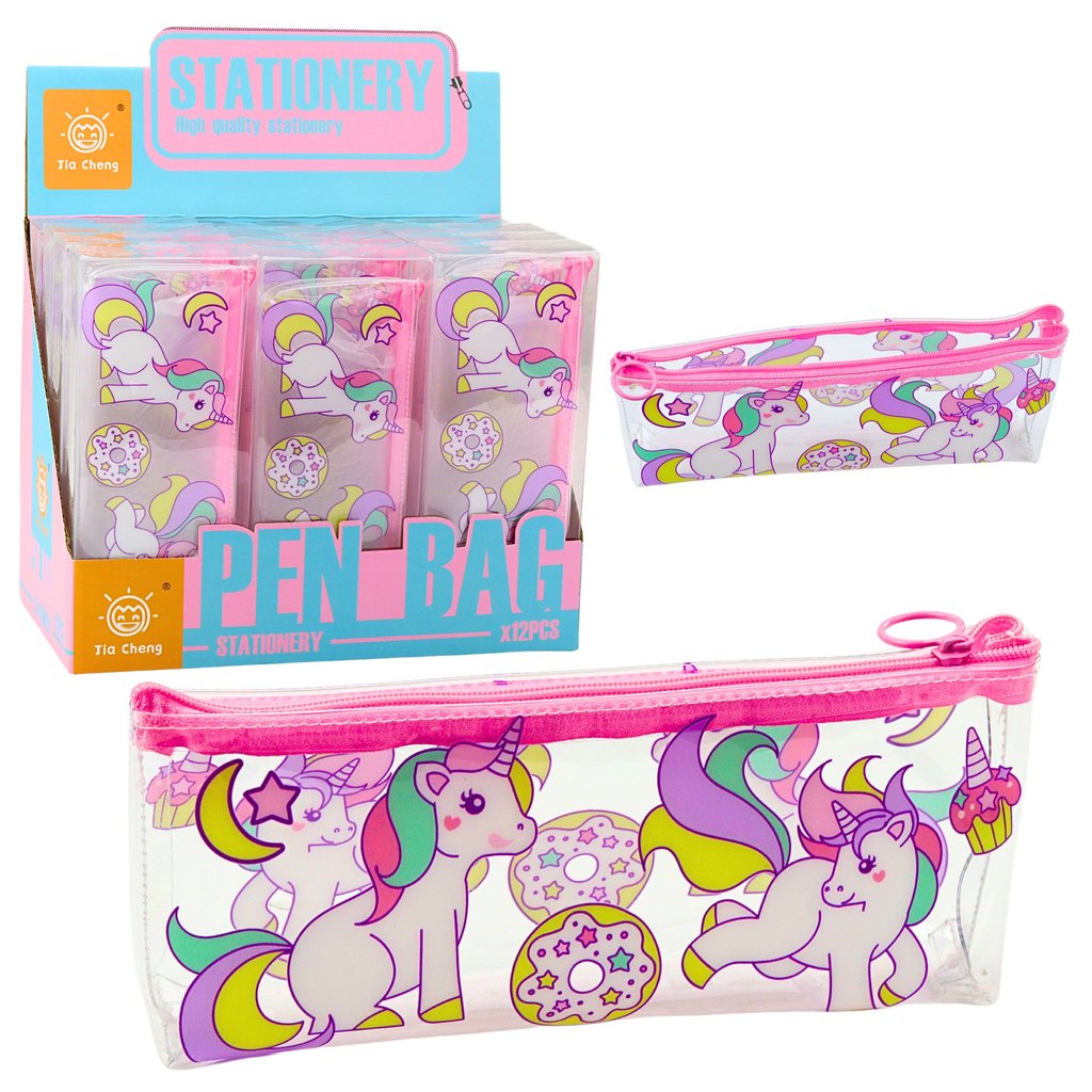 Průhledný penál s motivem jednorožců je roztomilý a praktický doplněk pro každého studenta.