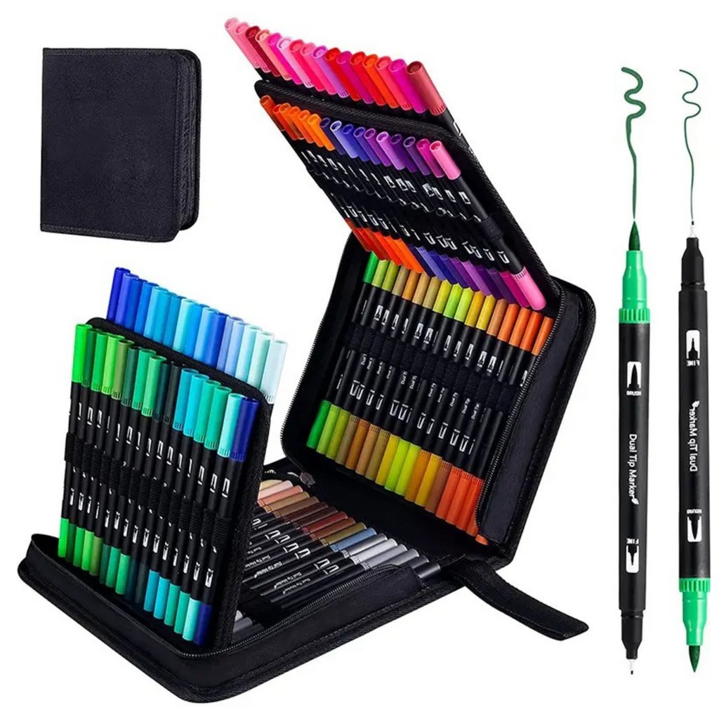 sadě 120 barevných oboustranných fixů, které uspokojí potřeby každého umělce, studenta nebo nadšence do ručních prací Oboustranná konstrukce každého fixu nabízí různé tloušťky hrotů: tenký pro precizní detaily a silnější pro barvení a vytváření větších ploch