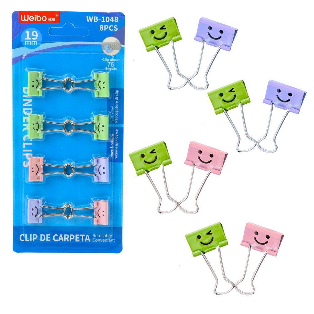 Sada barevných kancelářských klipů s motivem smajlíků je funkční a estetický doplněk pro organizaci dokumentů ve škole, kanceláři nebo doma Sada obsahuje 8 kovových klipů o šířce 19 mm, které snadno sepínají až 75 listů papíru