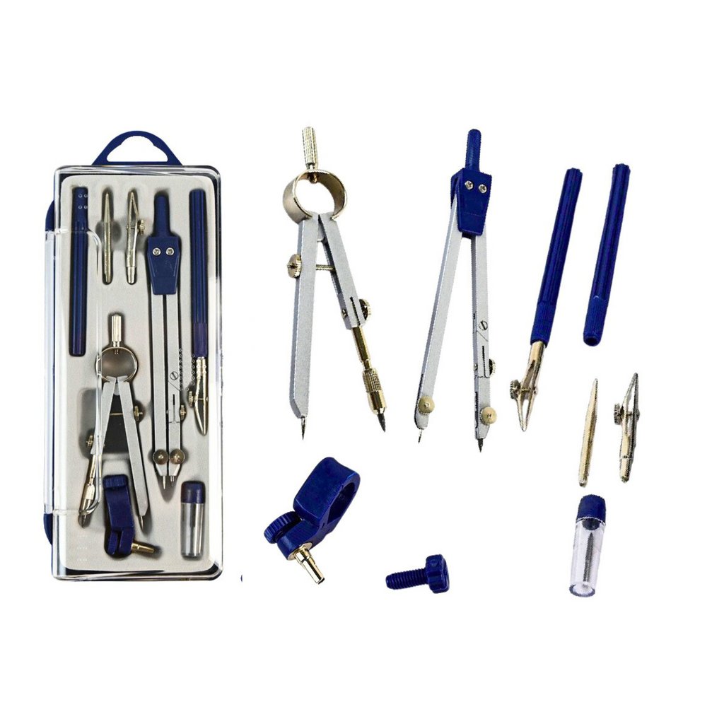 Sada kresebných potřeb zahrnuje geometrické kružítko a technický organizér, složený z devíti prvků Tento univerzální set obsahuje všechny nezbytné nástroje pro dosažení přesnosti a profesionálních výsledků