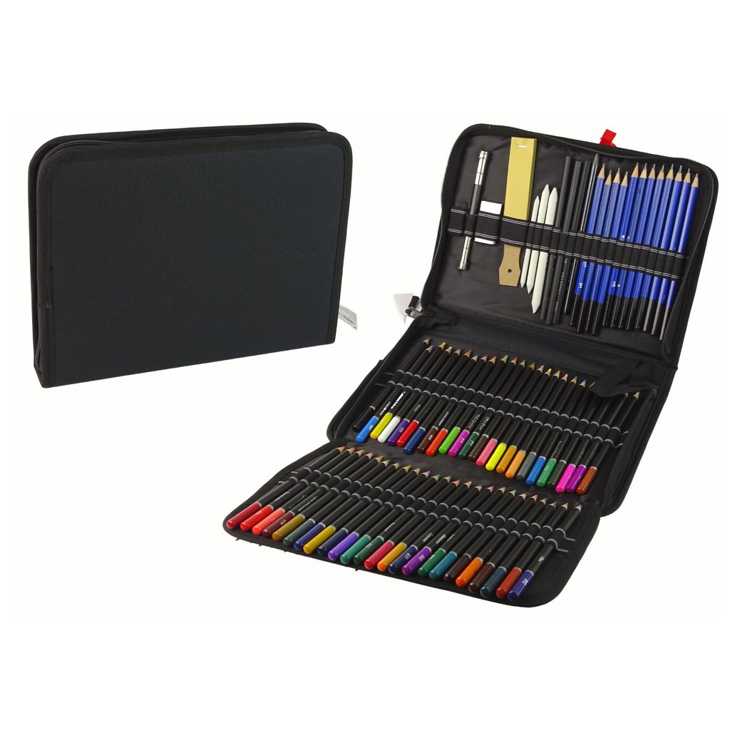 - Pastelky a tužky: Sada obsahuje 72 pastelek a 12 tužek různé tvrdosti, které umožňují přesné kreslení a stínování