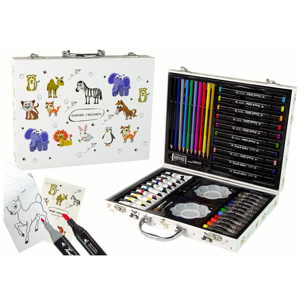 - 68 dílů Tato sada uměleckých potřeb v bílé pevné kufříku s přátelskými zvířátky je ideálním dárkem pro malé umělce, kteří chtějí objevovat svět umění a zábavy