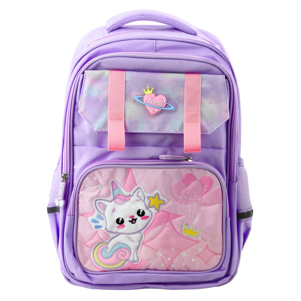 Fialový školní batoh s kočičkou a reflexními prvky Tento fialový školní batoh s roztomilým motivem kočky a barevnými prvky je kombinací estetiky, funkčnosti a pohodlí
