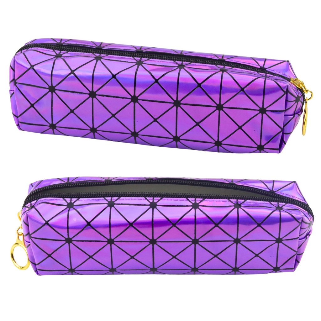 Fialový holografický jednokomorový penál je moderním a stylovým doplňkem ke školním i kancelářským potřebám, který přitahuje pozornost lesklým povrchem a geometrickým vzorem.