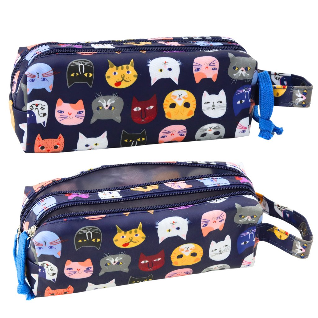 Školní Penál Barevné Kočky Dvě Kapsy Tmavomodrý 22cm