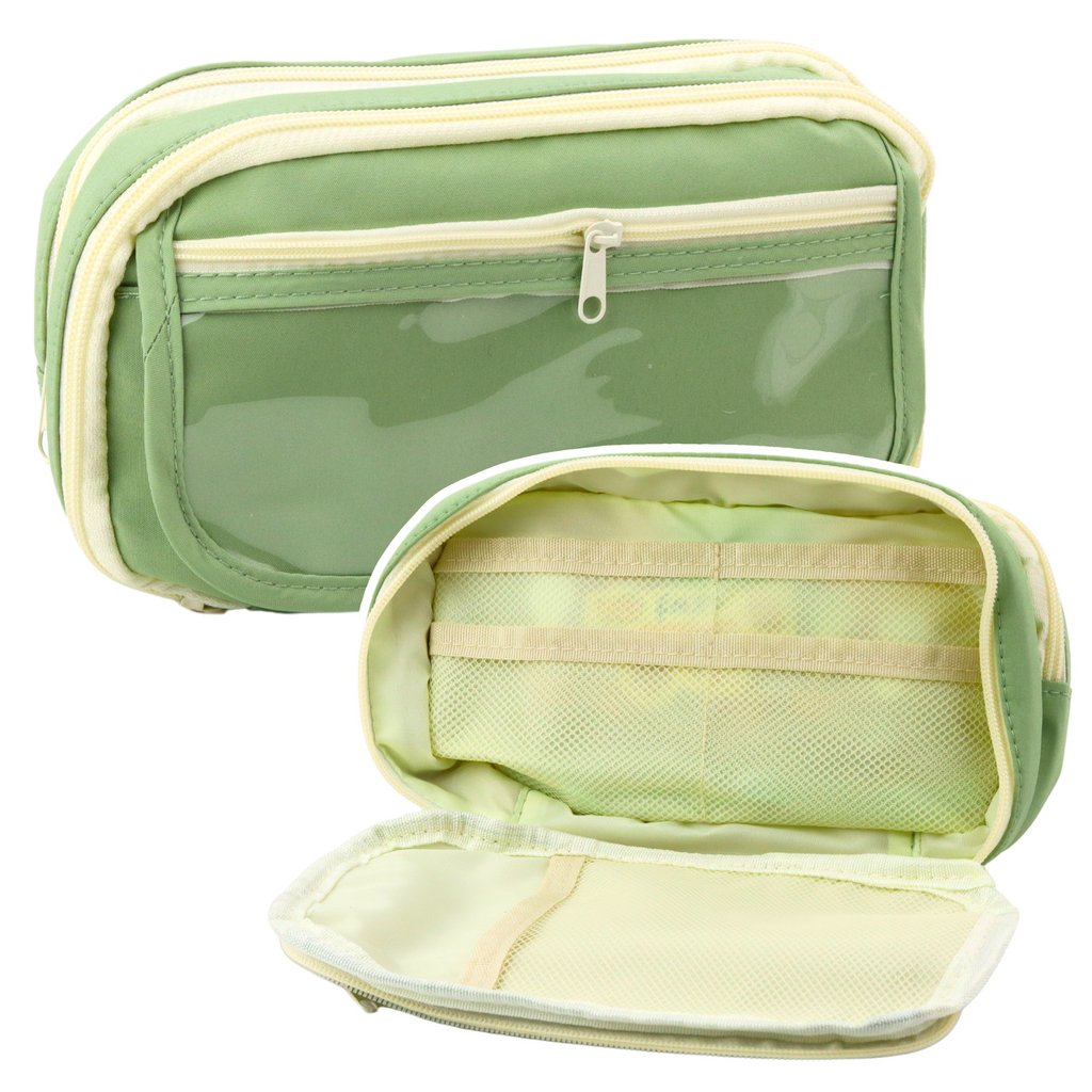 Každá z komor je uzavíratelná na zip, což zajišťuje bezpečné ukládání per, tužek, pastelek či pravítek Uvnitř se nacházejí síťové kapsy, ideální pro menší předměty, jako jsou gumy, ořezávátka, sponky nebo jiné drobné příslušenství