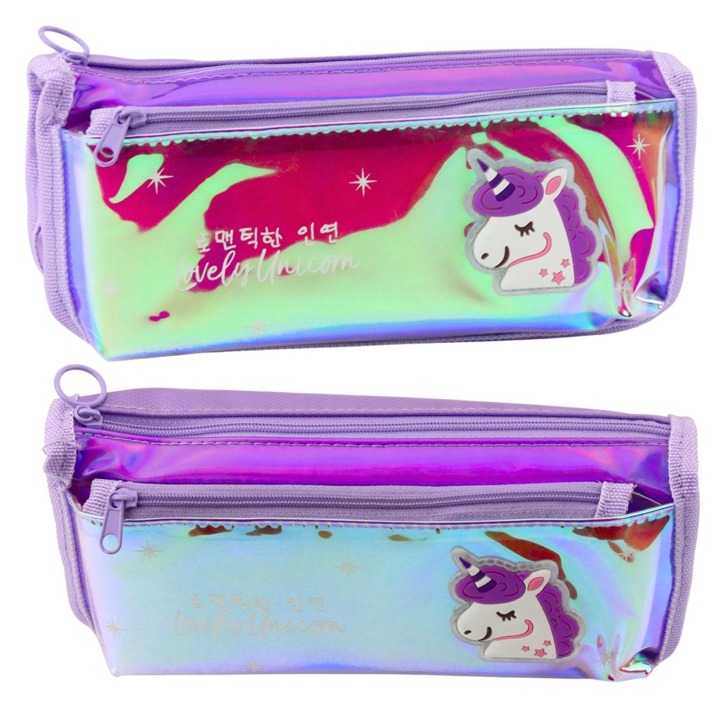 Fialový školní penál s holografickým jednorožcem je stylový a praktický doplněk k školní výbavě každého dítěte Vyrobený z holografického materiálu, který se třpytí různými barvami pod vlivem světla, okouzluje vzhledem a přitahuje pozornost