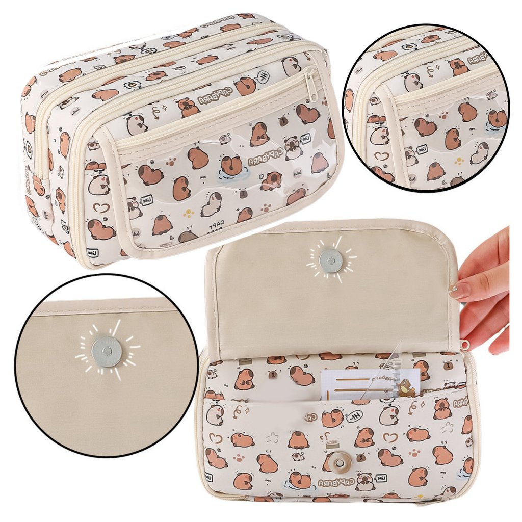 Školní pouzdro s kapibary, bílé je ideální volbou pro studenty, kteří ocení praktický a rozkošný design V krémové barvě s obrázky sympatických kapibar toto pouzdro snadno vynikne mezi ostatními školními potřebami