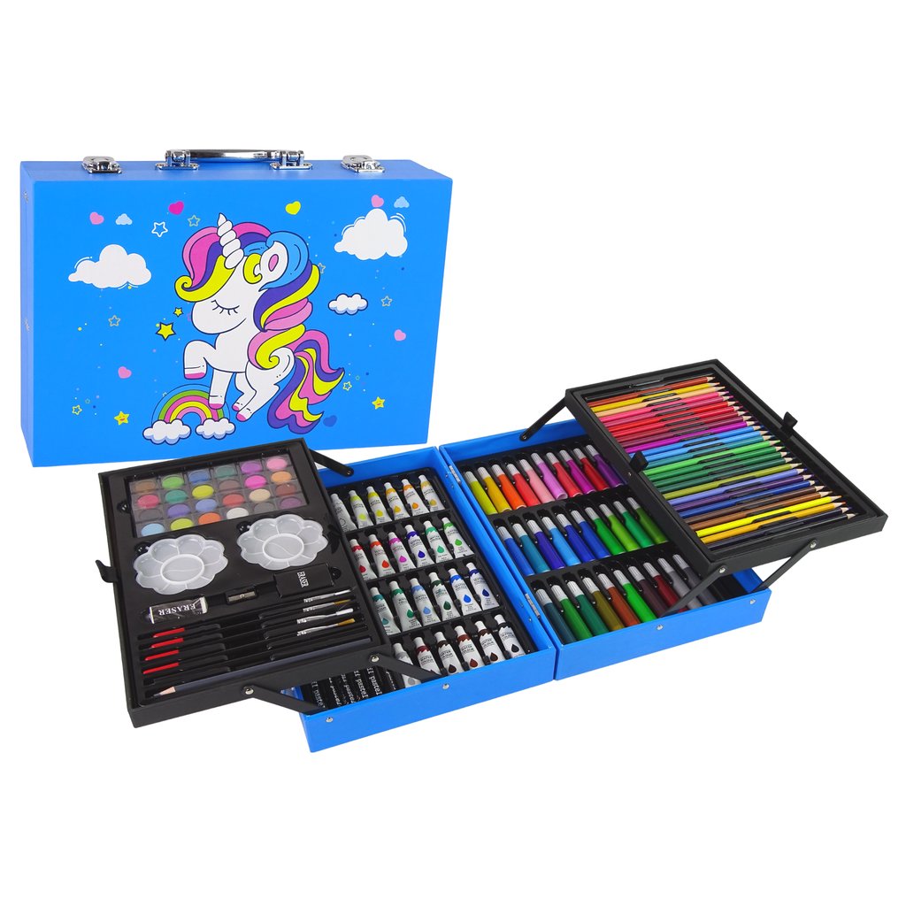Umělecká sada pro děti 145 dílů ⭐ V modrém kufříku s jednorožcem Ideální umělecká sada, která potěší každého malého umělce! Obsahuje všechny potřebné pomůcky pro tvorbu krásných děl: pastelky, fixy, barvy a další doplňky