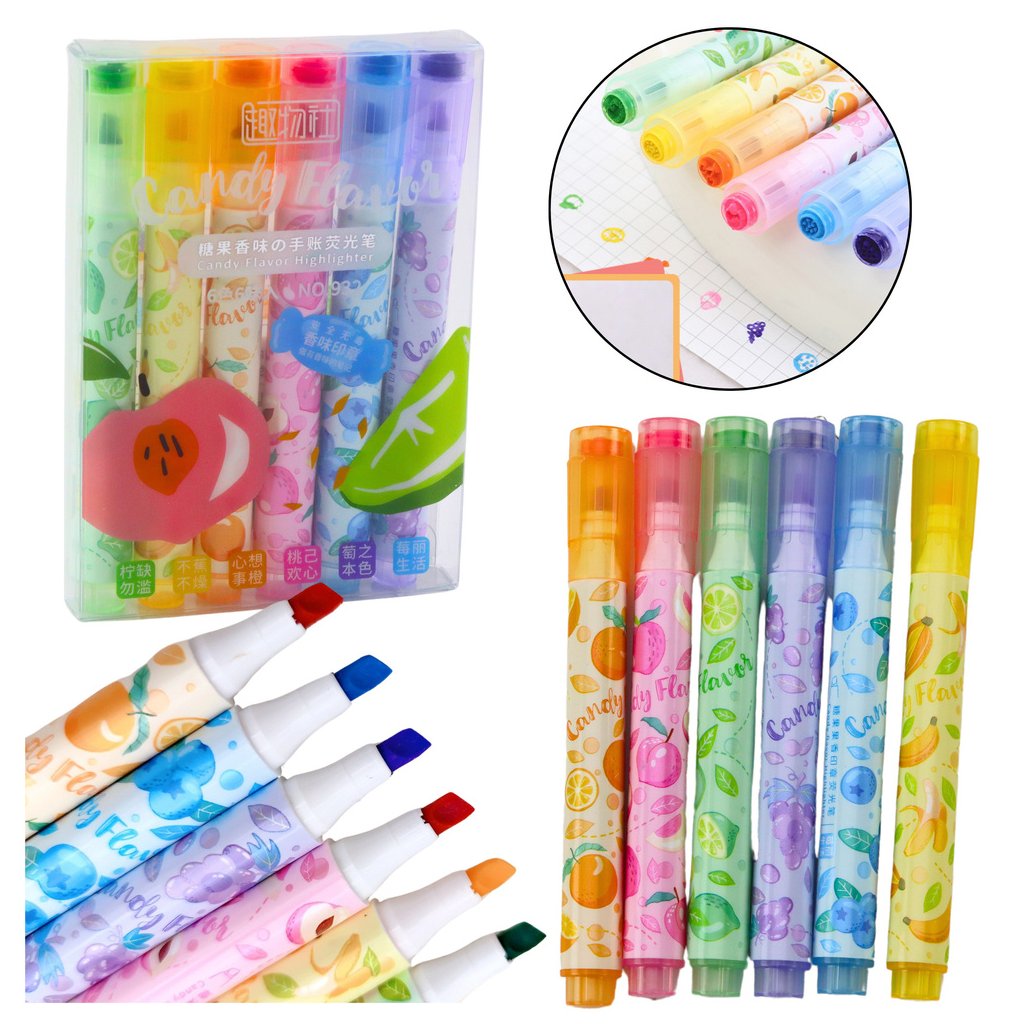 Barevné ovocné zvýrazňovače s razítkem – Sada 6 kusů Při studiu a práci si přidejte trochu radosti s naší sadou barevných zvýrazňovačů, které kombinují funkčnost se zábavou!