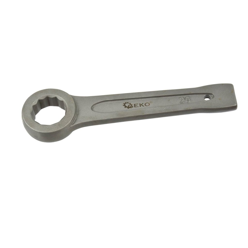 Očkový klíč na zatloukání určený k odšroubování pevně utažených nebo zaseknutých šroubů povýkoní úderů kladivem na konec rukojeti klíče.
