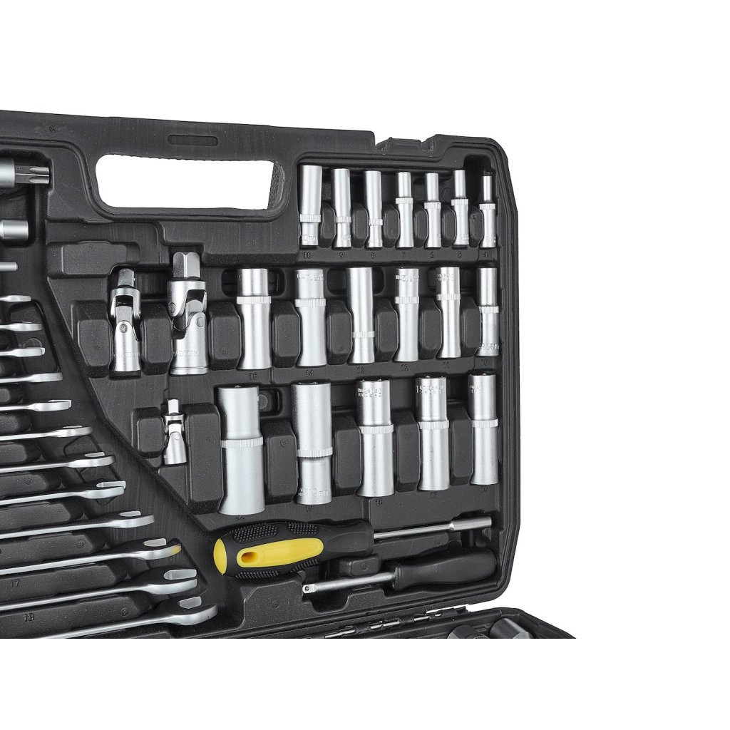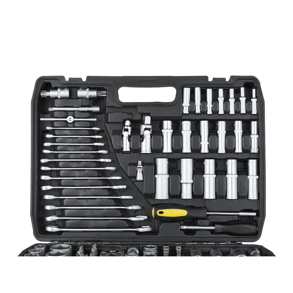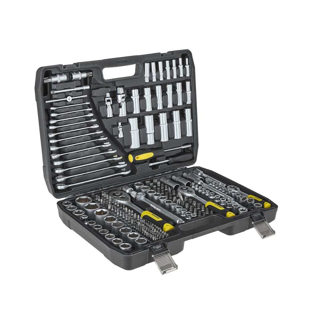 216dílná sada nástrčných klíčů, plochých klíčů a příslušenství, která splní očekávání jak domácích kutilů, tak profesionálních mechaniků. Vyrobena z vysoce kvalitní chrom-vanadové nástrojové oceli (CrV), zaručuje dlouhou životnost a odolnost proti mechanickému poškození.