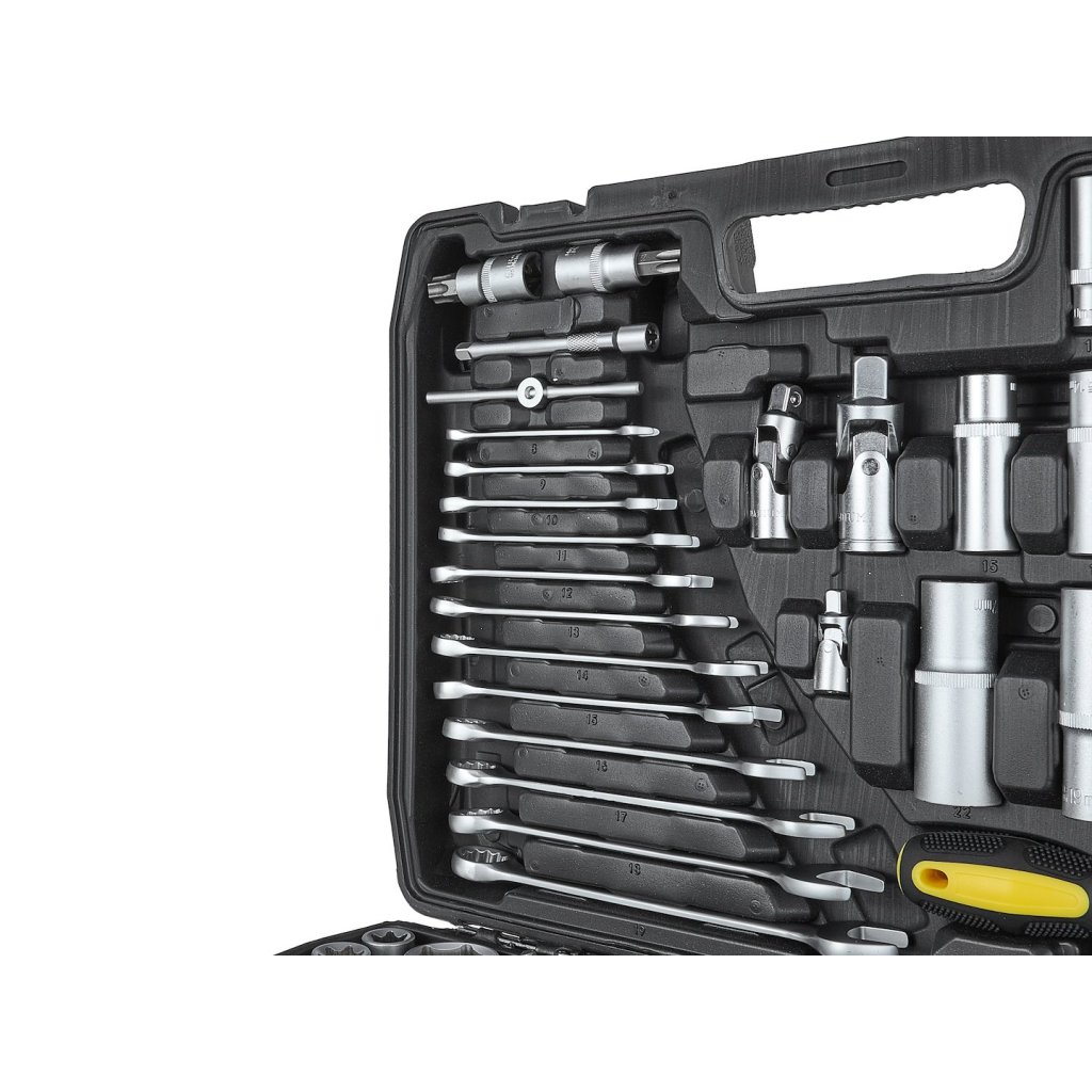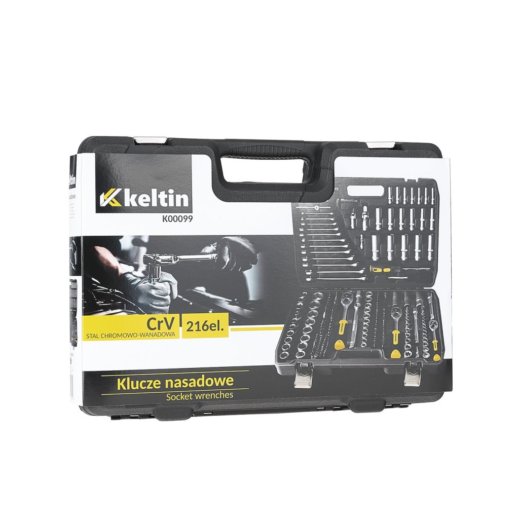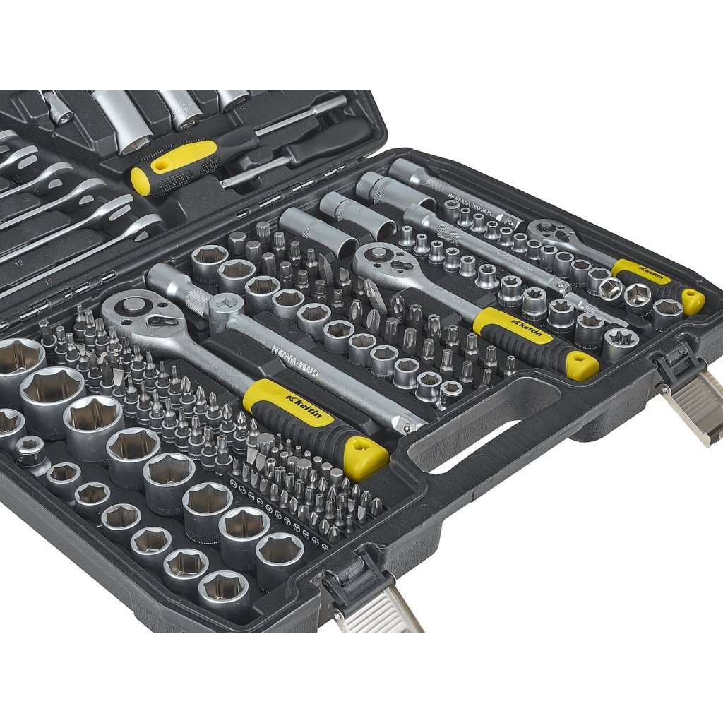 216dílná sada nástrčných klíčů, plochých klíčů a příslušenství, která splní očekávání jak domácích kutilů, tak profesionálních mechaniků. Vyrobena z vysoce kvalitní chrom-vanadové nástrojové oceli (CrV), zaručuje dlouhou životnost a odolnost proti mechanickému poškození.