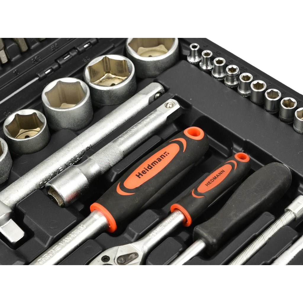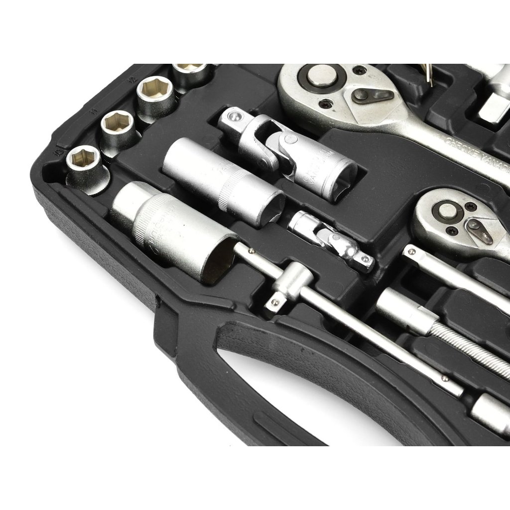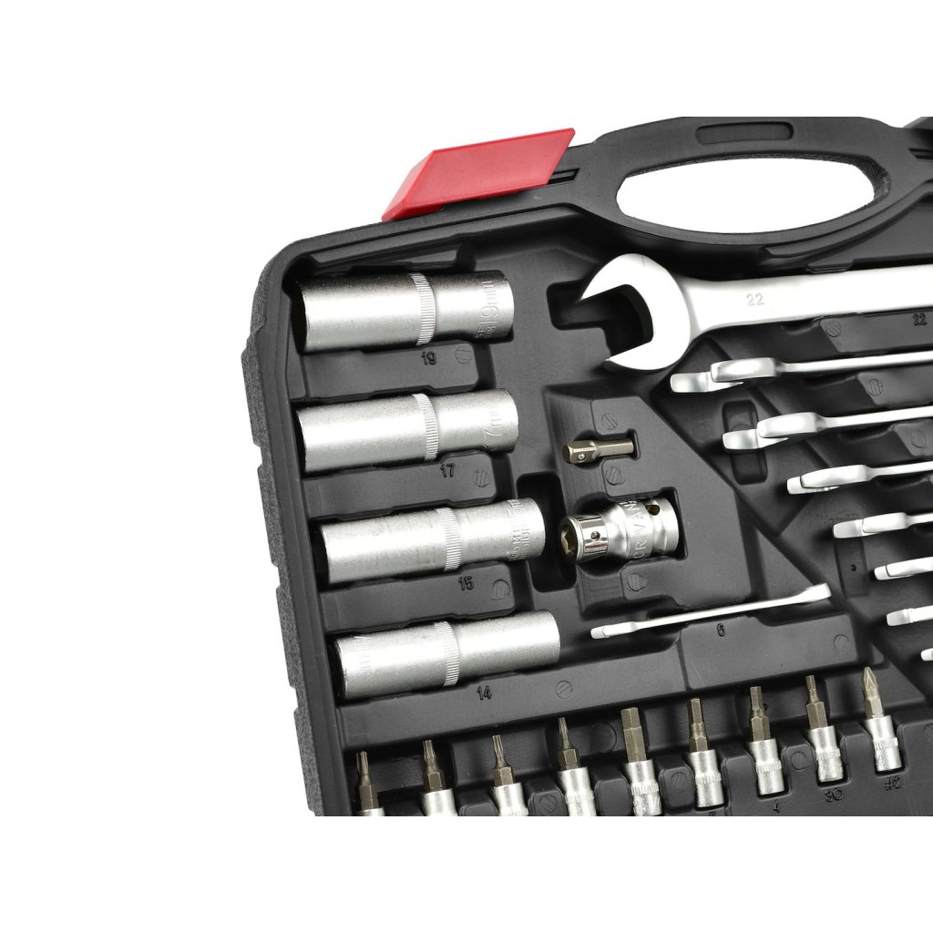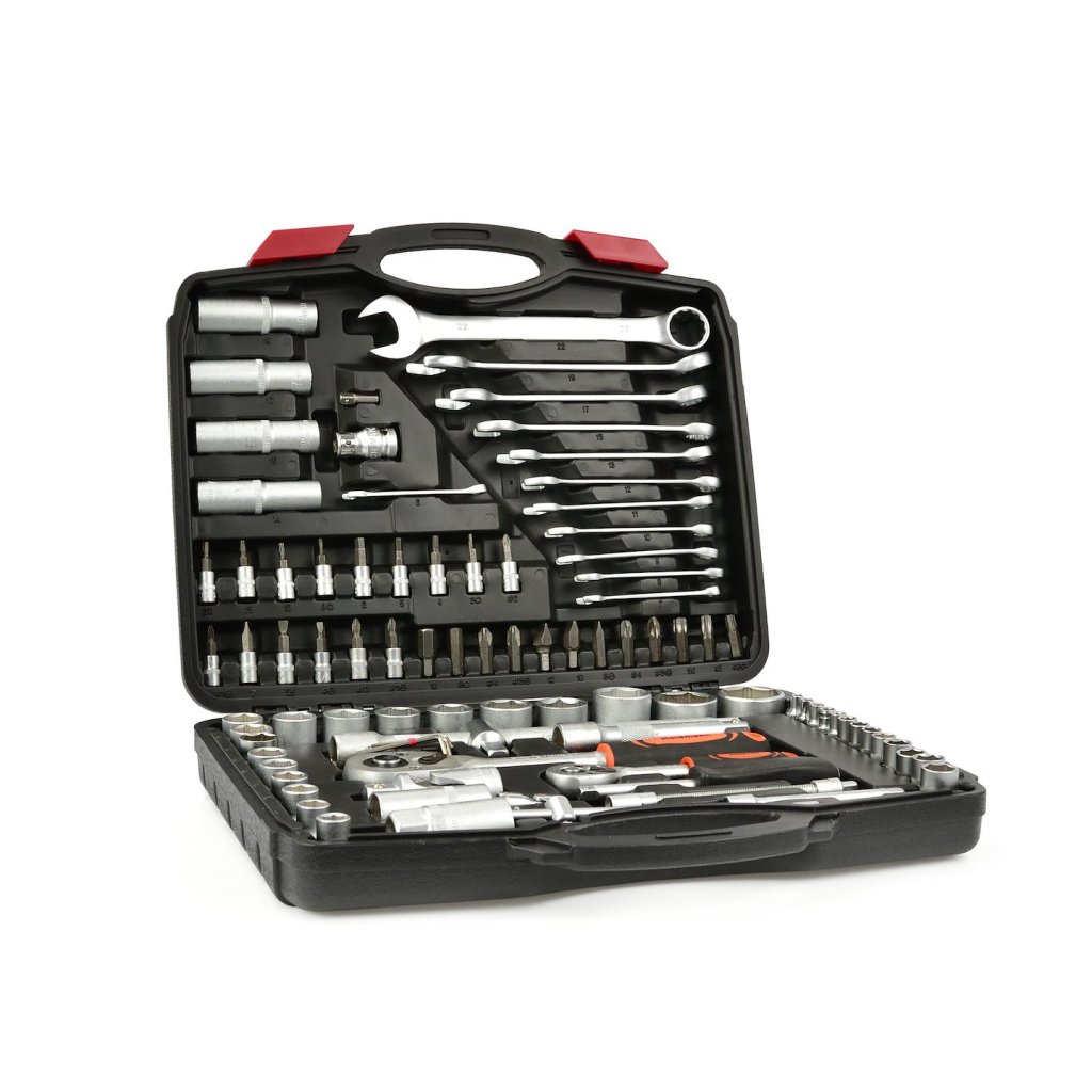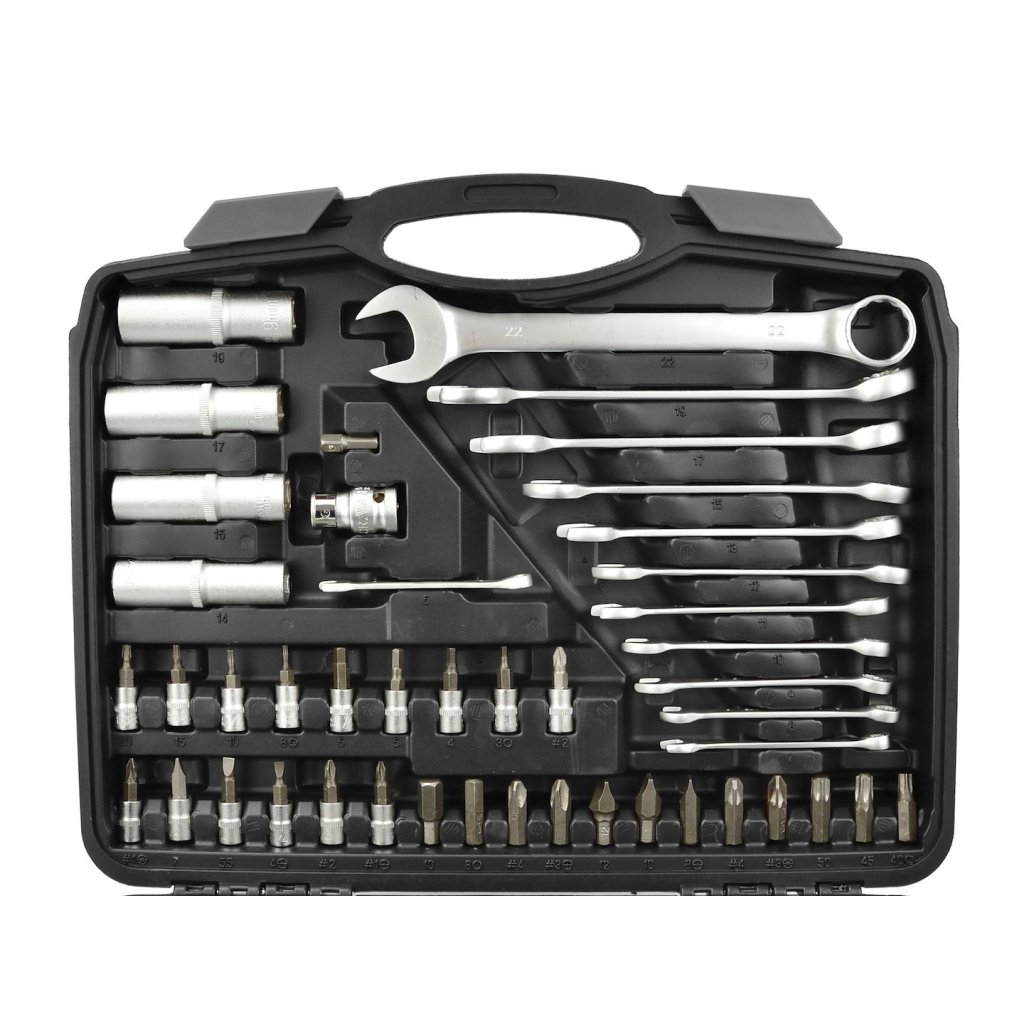 Sada 94 kusů nástrčných klíčů a bitů. Všechny nástroje jsou vyrobeny z chrom-vanadové oceli.