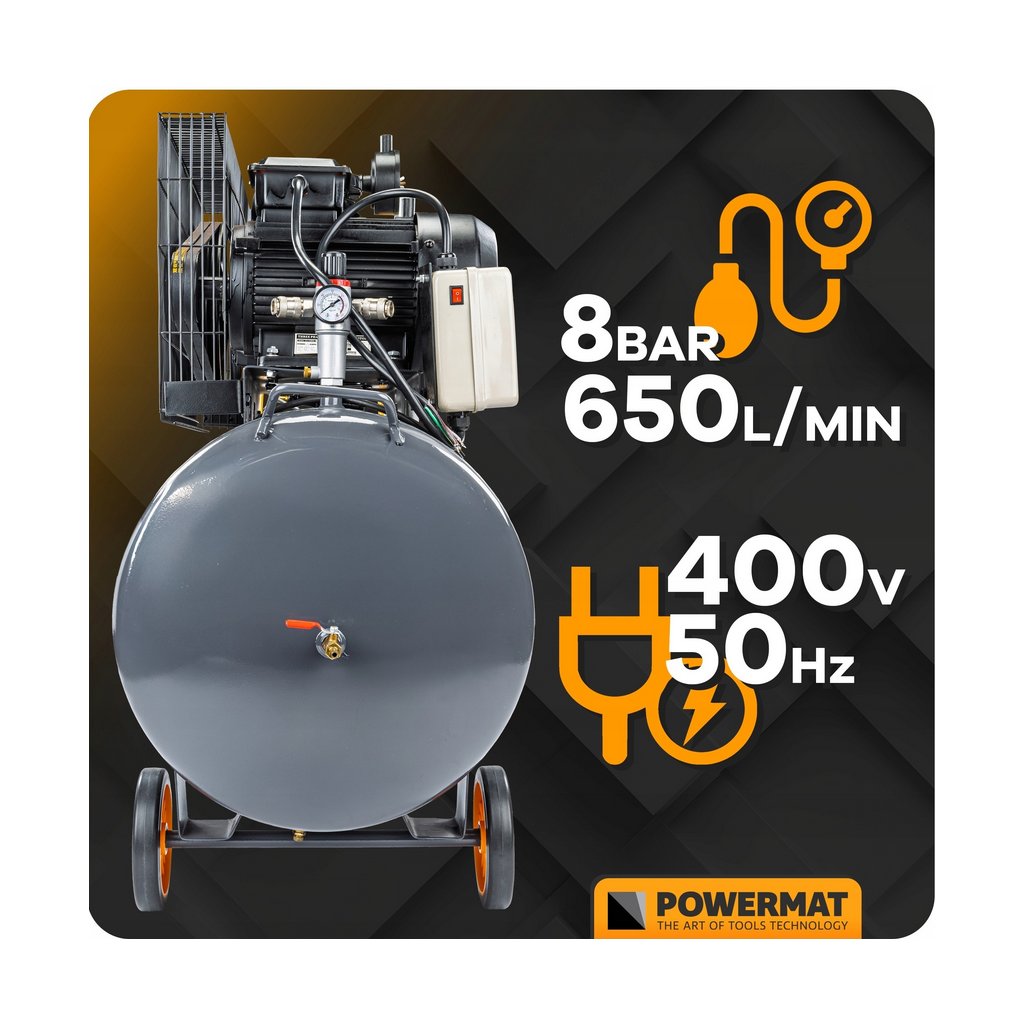 Výkonný olejový pístový kompresor s nádrží 200 l, maximálním tlakem 8 bar a výkonem přibližně 650 l/min. Napájení 400 V zajišťuje stabilní a účinný provoz. Ideální pro dílny, servisy a lehkou výrobu: lakování, pneumatické nářadí, ofukování a další práce, kde je potřeba velký objem stlačeného vzduchu.