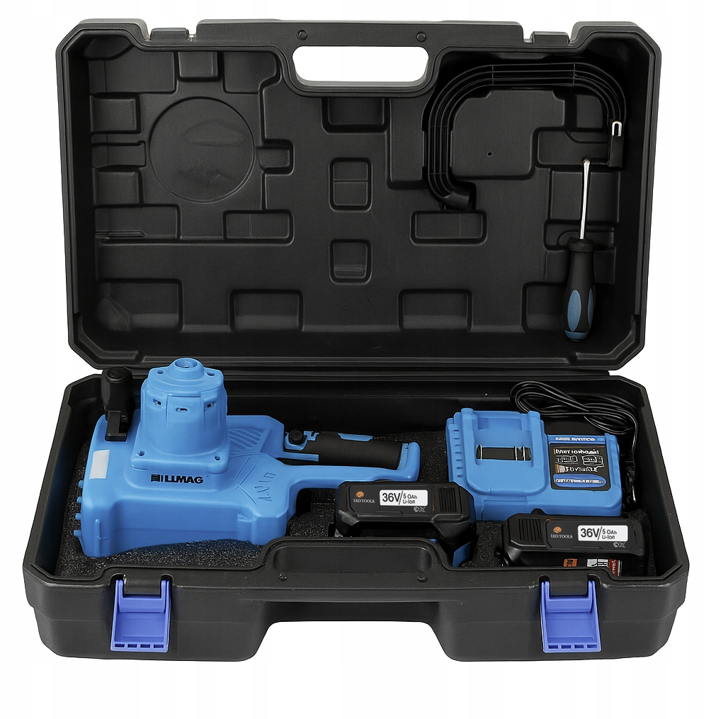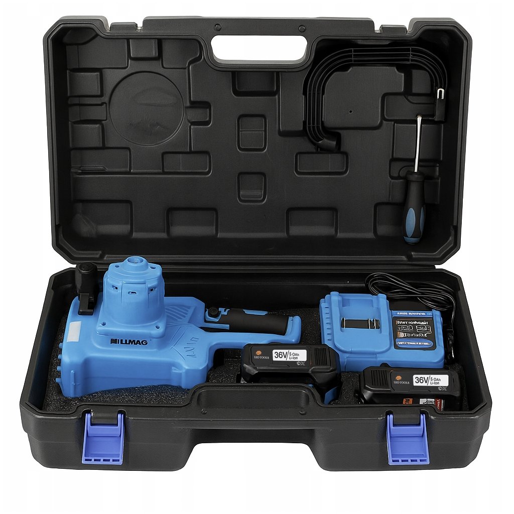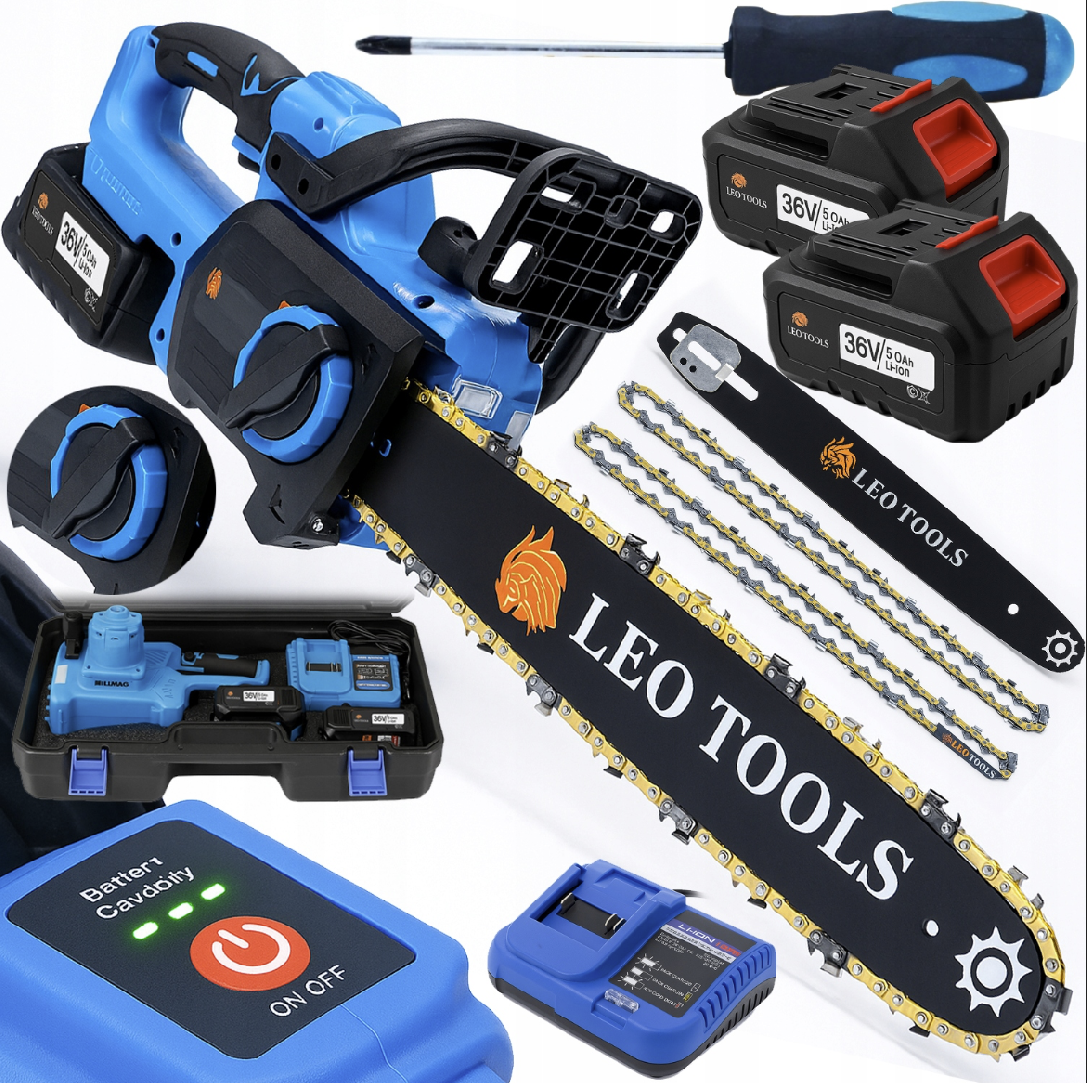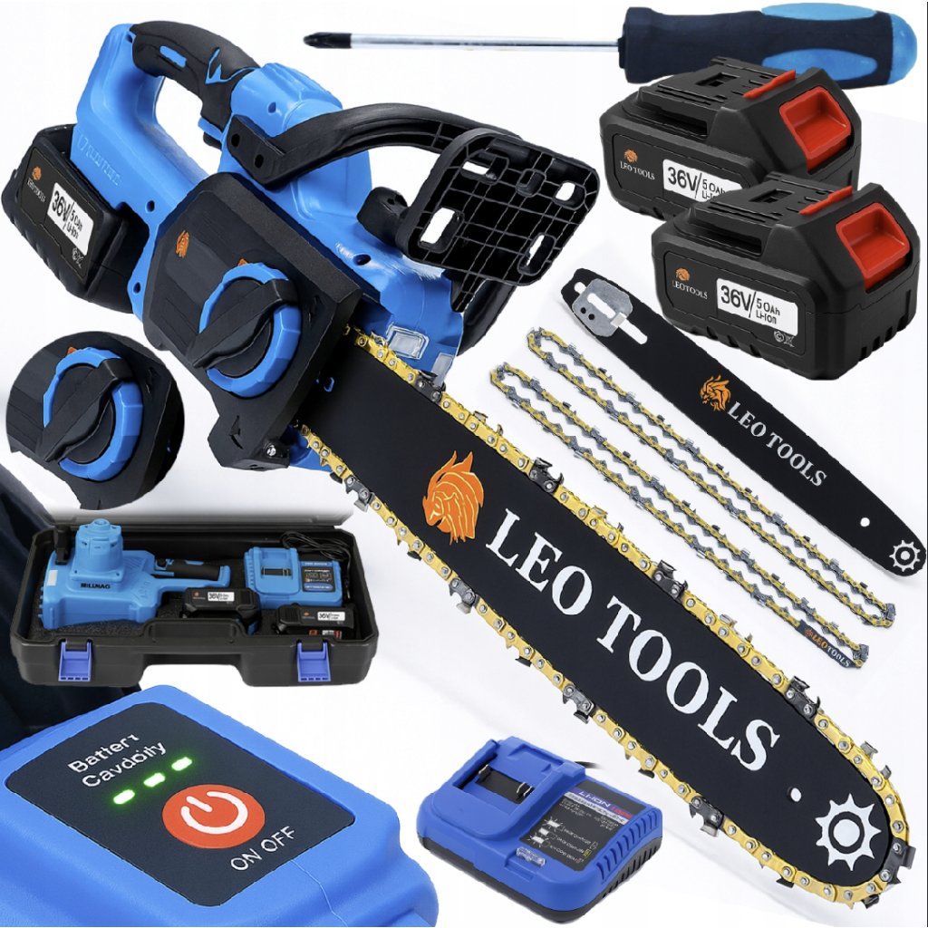 - Aku řetězová pila 36 V – 30 cm lišta, 2× 5 Ah baterie, LCD displej, kufr – výkon, přesnost a pohodlné ovládání