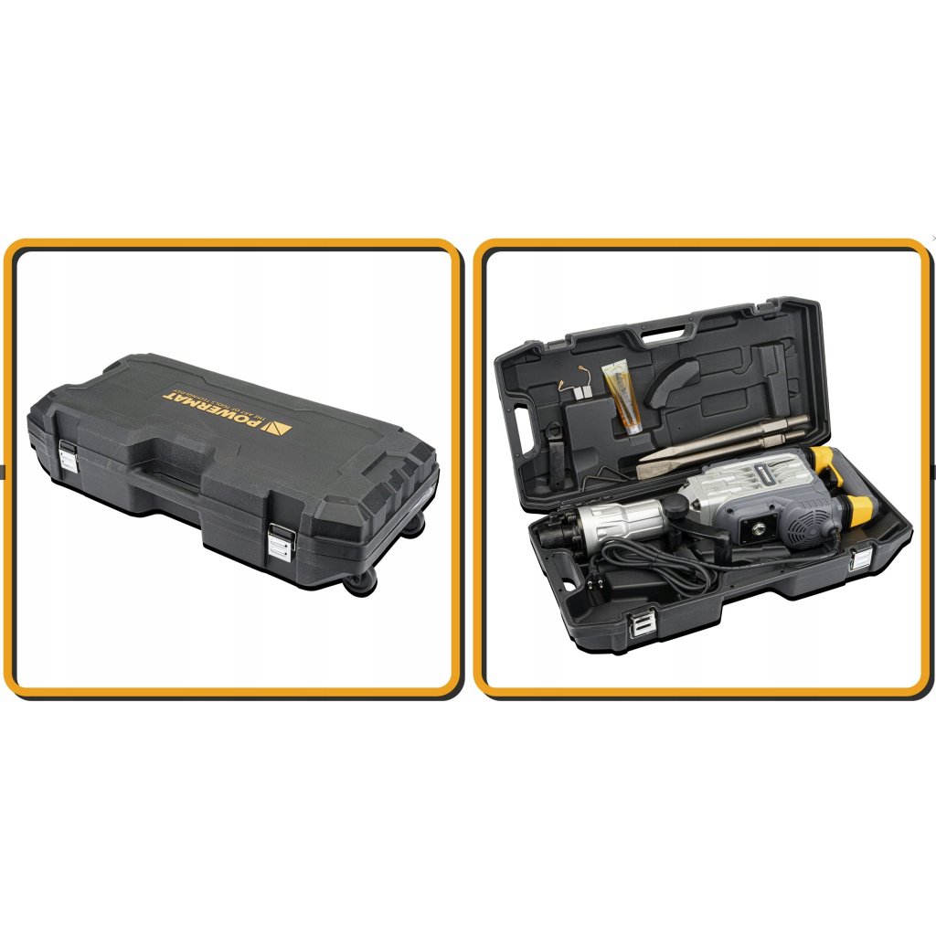 Součástí balení je praktický kufr, špičák a plochý sekáč. Vše bezpečně uložené, připravené k okamžitému použití.