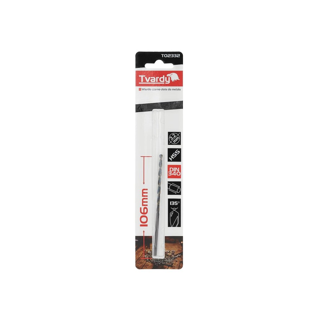 Vrták je zabalen v blistru s otvorem pro zavěšení na háček.