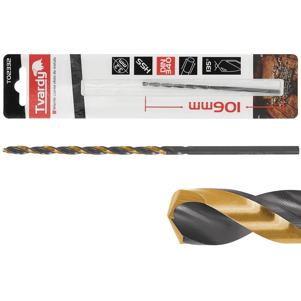 Prodloužené vrtáky do kovu, zlaté a černé, vyrobené z rychlořezné oceli M2 HSS, potažené vrstvou TiN (nitrid titanu). Vrtáky splňují normu DIN 340. Válcové držadlo.