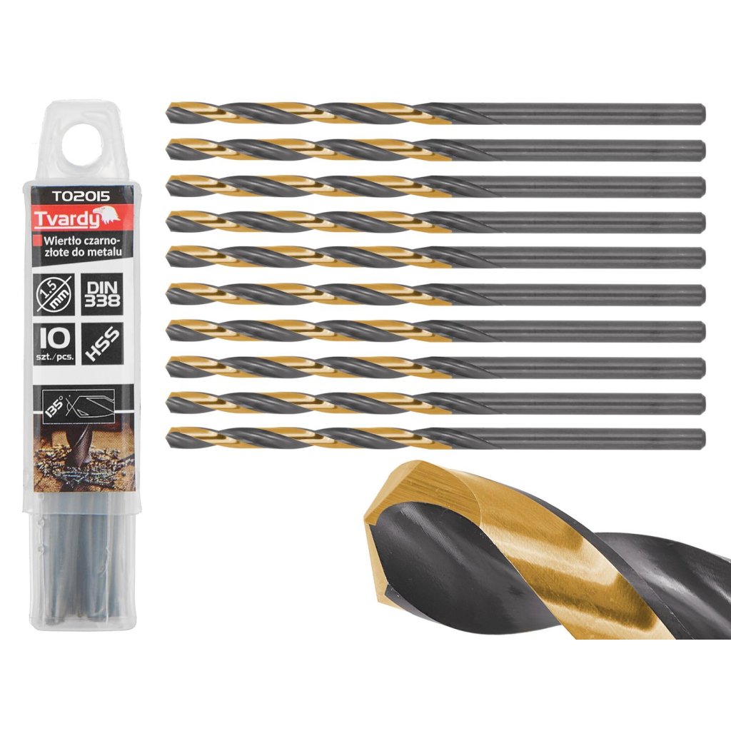 Zlaté a černé vrtáky do kovu vyrobené z rychlořezné oceli 4341 HSS, pokryté vrstvou TiN (nitrid titanu). Vrtáky jsou v souladu s normou DIN 338. Válcové držadlo.