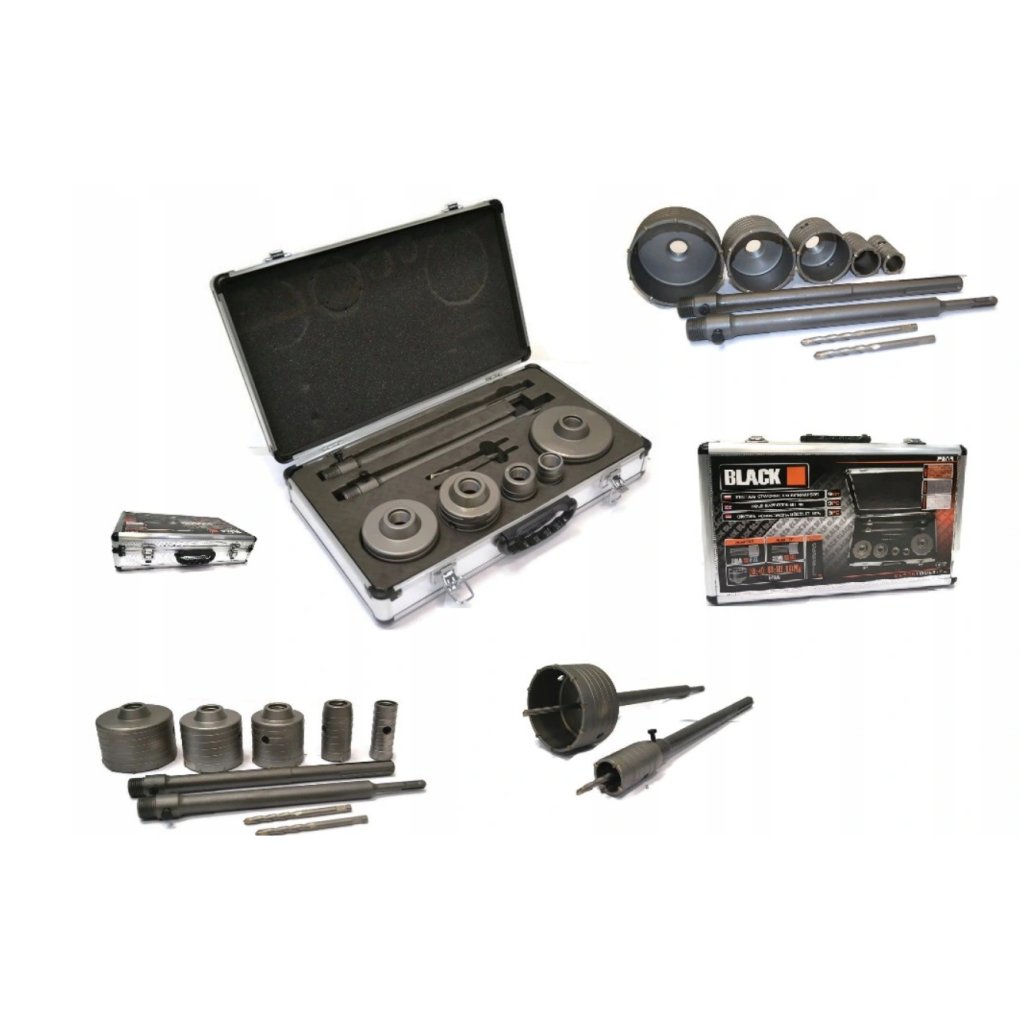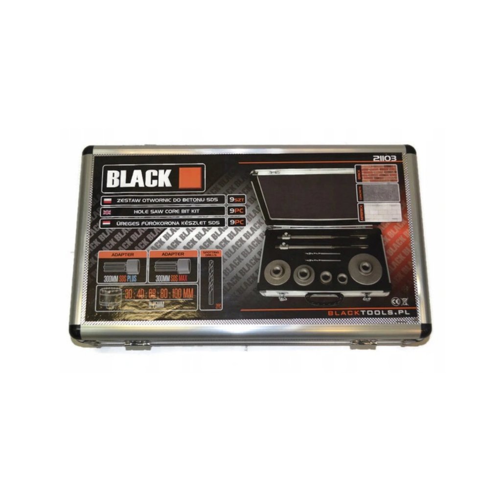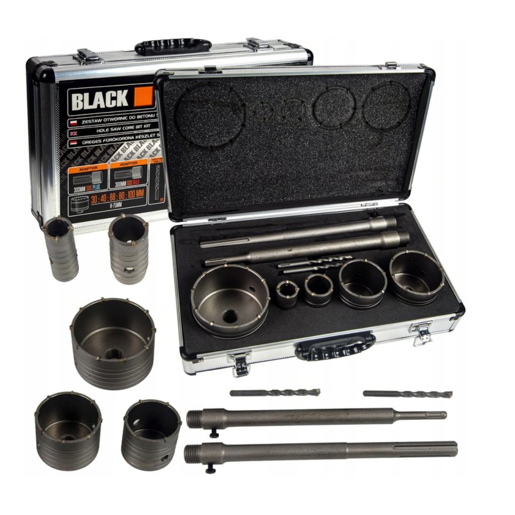 Korunkové vrtáky do betonu SDS PLUS, SDS MAX, 30-100mm, sada 9 ks Black – kvalitní provedení pro spolehlivé použití v dílně, garáži i na stavbě.